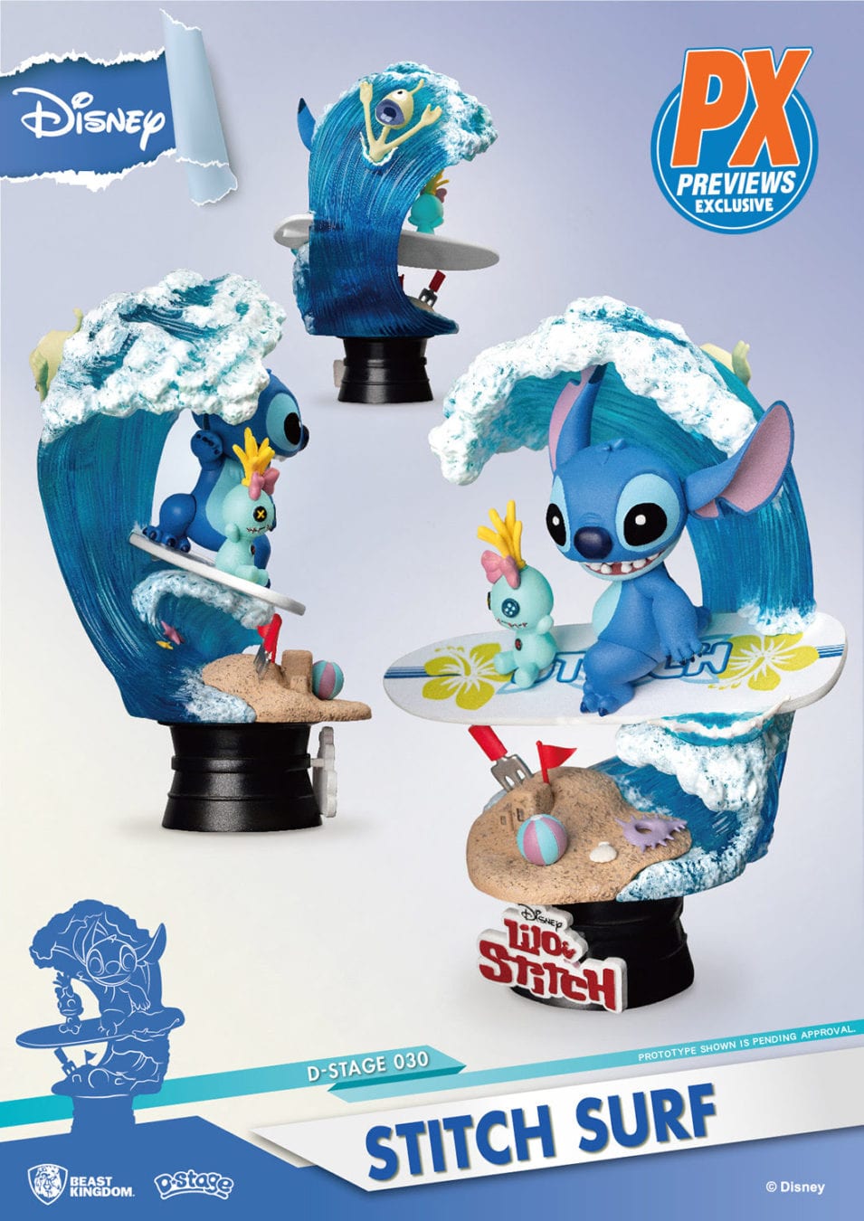 Stitch has always been one for beach fun and whilst he himself may not exactly have a beach-body, that hasn“t stopped him from catching waves and breaking hearts! With his green ragdoll in tow, the PREVIEWS Exclusive DS-030 Stitch Surf D-Stage Statue is ready to ride some serious waves on his Hawaii themed surfboard. The highly detailed surfboard with hibiscus flower prints, is accompanied by a dynamic and transparent wave, bringing home a highly realistic recreation of summer fun. Included in the diorama, collectors can enjoy a sandy beach based, completed with beach balls, shells and sand adding the resort style atmosphere.