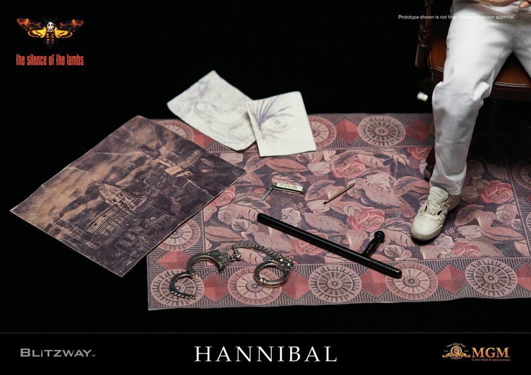 The BLITZWAY Hannibal Lecter White Prisoner Uniform version includes multiple interchangeable arm and hand accessories featuring a pen clip and nightstick accessories. Also included is a screen accurate chair, a pair of handcuffs, a folding knife, a fountain pen, a “Clarice”“ drawing prop, and a cathedral church drawing prop.