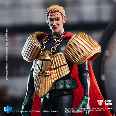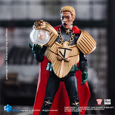 Due for release in the fourth quarter of 2022, this poseable figure with 16 points of articulation is dressed in Cal’s Chief Judges’ uniform, including oversized torso shield and cape. He also comes with a scale model of Deputy Chief Judge Fish encased inside his ornately decorated goldfish bowl, and two swappable heads – one displaying the smug grin of a tyrant, the other an open-mouthed scowl about to deliver a cruel outburst that could easily condemn millions more to death!