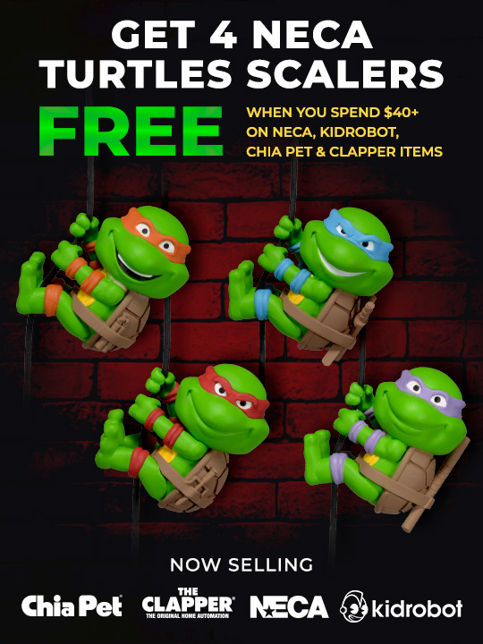 Spend $40 on NECA, Kidrobot, Chia Pet, and/or The Clapper products and you will receive four NECA TMNT mini scalers. From the classic late ’80s cartoon, the Teenage Mutant Ninja Turtles are ready for action as Scalers mini characters! These cute, collectible minis attach to headphone cords, cables, straps and more for on-the-go fun. The Teenage Mutant Ninja Turtles assortment includes Leonardo, Michelangelo, Raphael and Donatello. Cowabunga!!