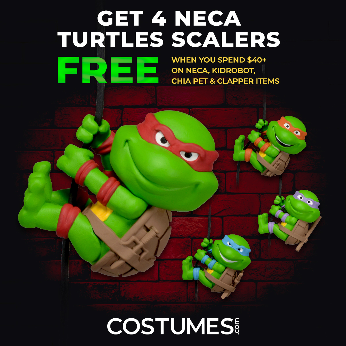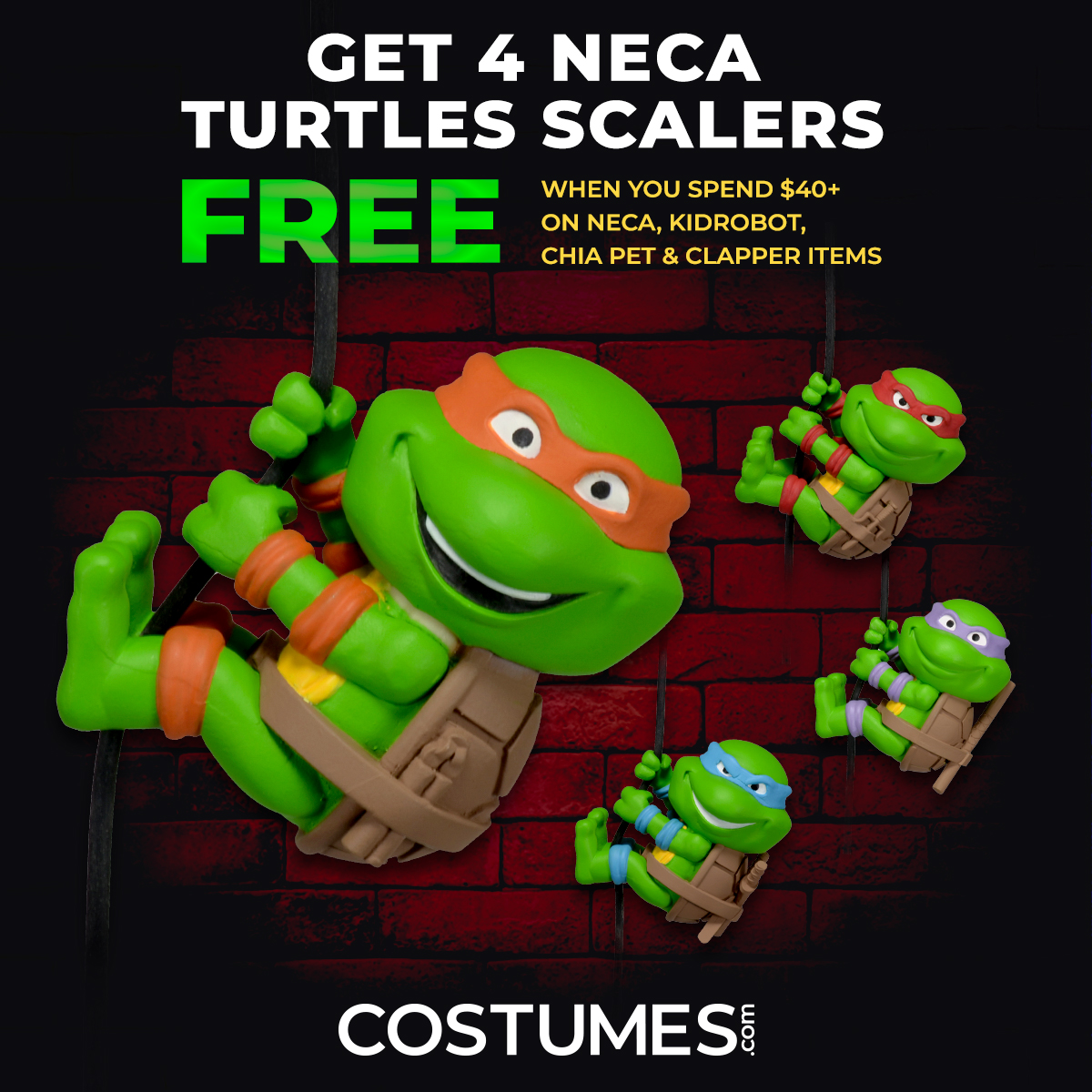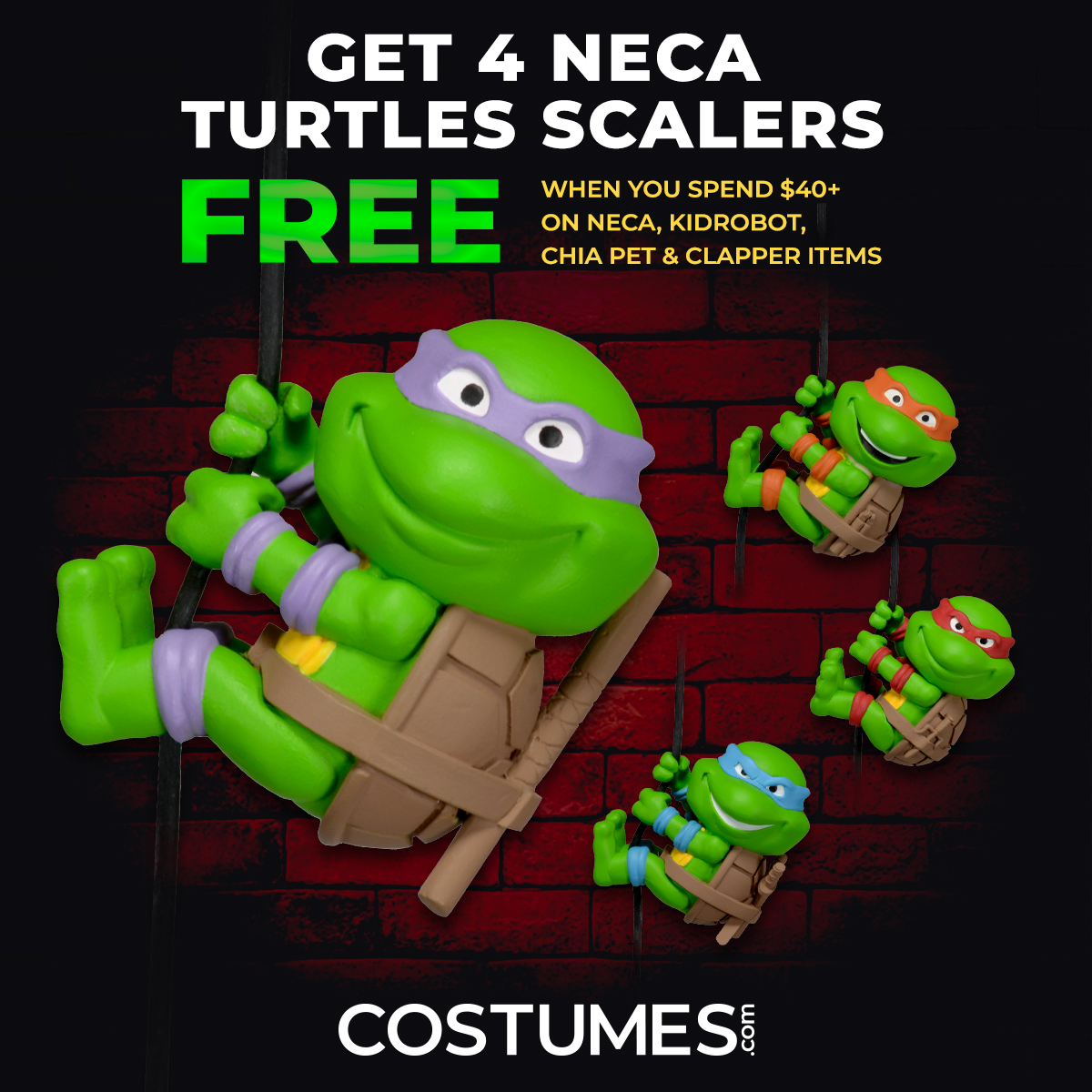 Costumes.com is not only your one-stop shop for officially licensed and original super hero and holiday-themed costumes, it’s now the home of the latest and greatest products from NECA, Kidrobot and Chia. Whether it’s the newest planters and clappers from the Star Wars universe, head knockers from Marvel and DC Originals, or the coolest Elton John jacket you’ve ever seen by Kidrobot, Costumes.com has you covered (literally) in the costumes and collectibles space. We’re celebrating these new additions to our site by offering a free set of Teenage Mutant Ninja Turtles Scalers to customers that spend $40 or more.