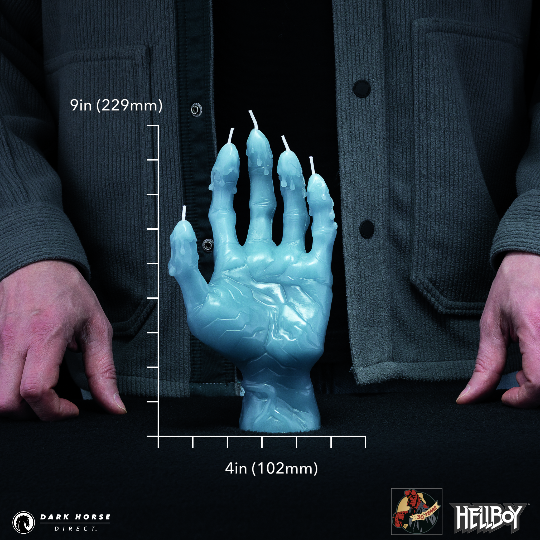 Inspired by the Hand of Glory candle which first appeared in Hellboy: Box Full of Evil, this handmade candle was created in partnership with 54Celsius and has been expertly molded based on the art of Mike Mignola. Made from 100% natural paraffin wax in the true-to-comics blue/gray color and including five separate wicks, this candle will bring light and magic to any setting for approximately 6 hours of burn time. (Hanged-man ingredients not included).