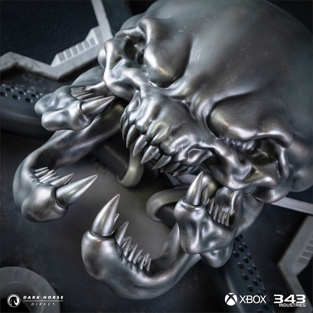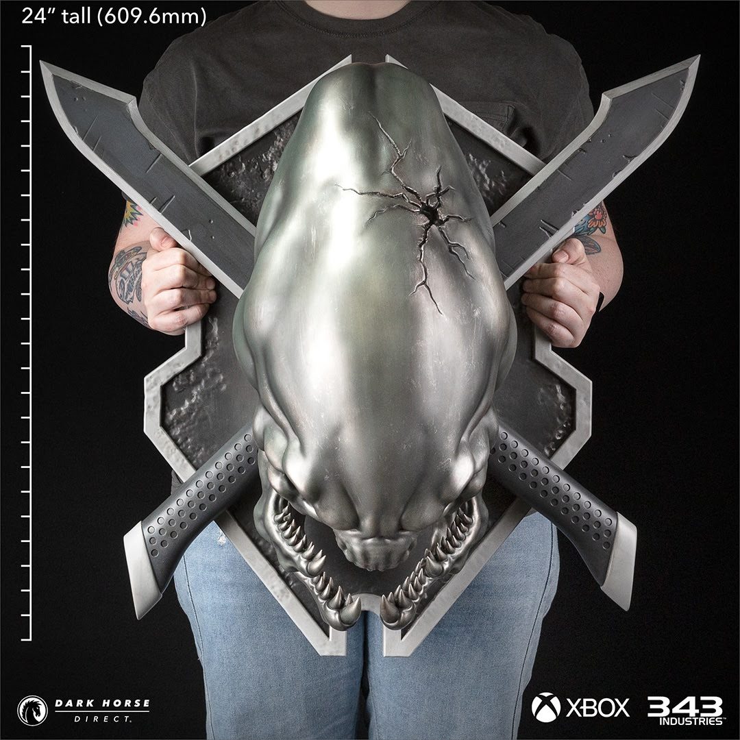 The classic game icon is brought to life, depicting a bullet-scarred Elite skull on crossed combat knives. It measures 24 inches in height and 27 inches across from knife tip to knife tip. Sculpted, prototyped, and painted by Bigshot Toyworks, the wall mount displays game-accurate gunmetal gray painting, and is the symbol of the pinnacle of achievement across the Halo universe—ready to adorn any home base.