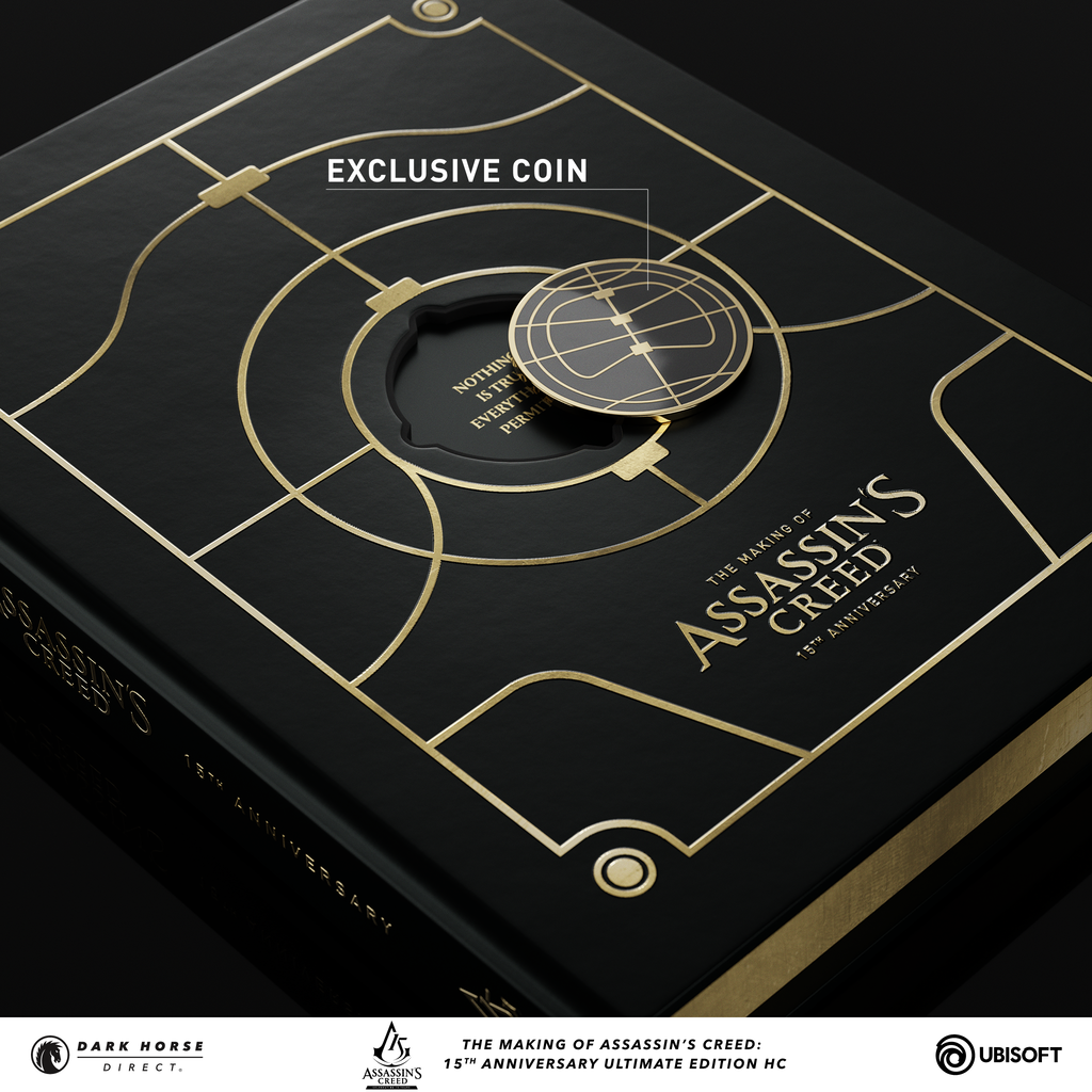 First to make its debut and in honor of the 15th anniversary of Assassin’s Creed®, Ubisoft and Dark Horse Direct have teamed up to celebrate the making of the game in ultimate fashion with The Making of Assassin’s Creed®: 15th Anniversary Ultimate Edition. The sleek 240-page Ultimate Edition hardcover collection features gold gilded pages and a satin ribbon bookmark, a luxurious folio containing two gallery-quality lithograph prints, and an exclusive metal art plate. All this is packaged together in an exclusive gold foil-stamped clamshell case with an embedded double-sided gold coin, featuring the Brotherhood’s anniversary crest and the ancient Apple of Eden.