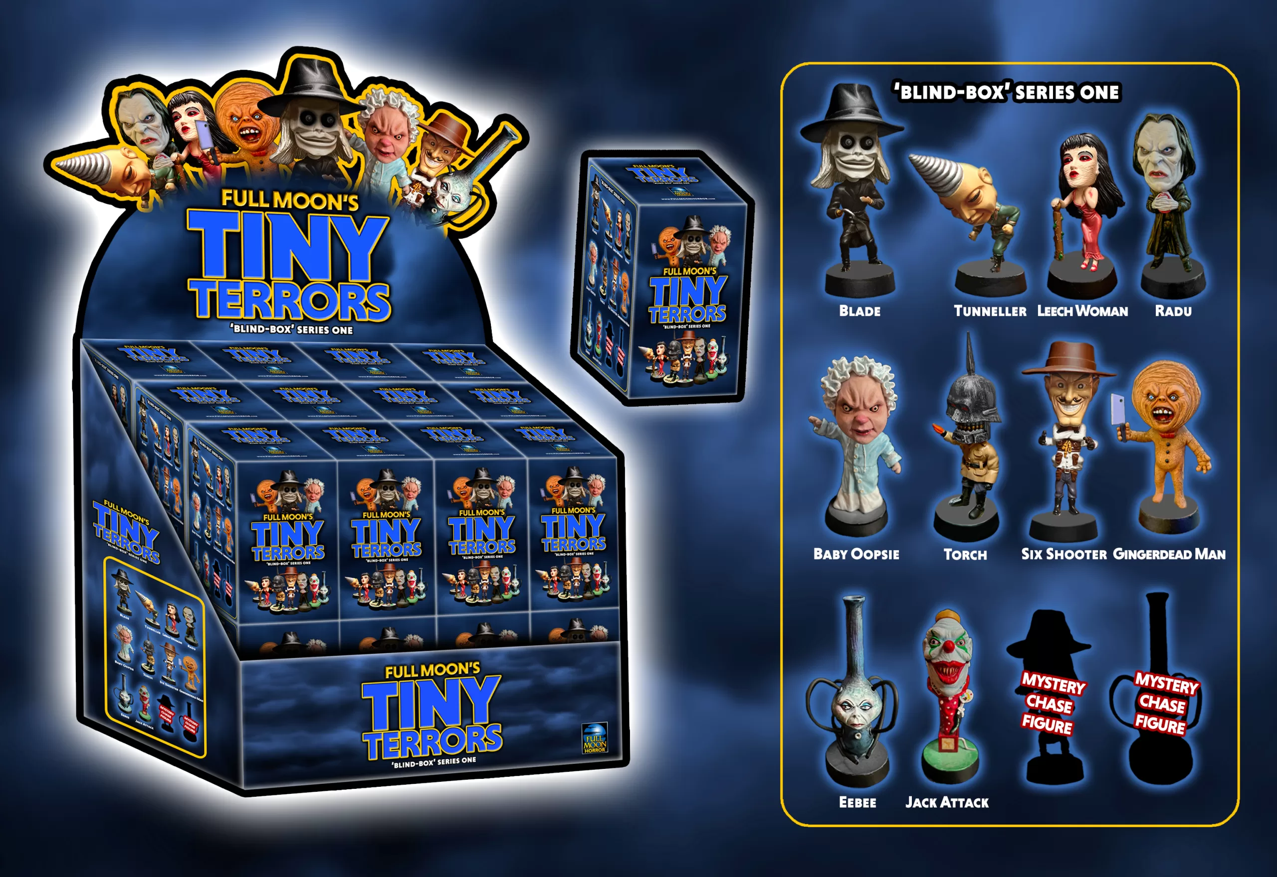 Prepare to embark on a spine-chilling journey into the world of horror with these terrifying, yet, adorable figures, each packaged in a collectible “Blind Box.” Inside each “Blind Box” lies a heart-pounding surprise – a fan-favorite, collectible character from the iconic Full Moon Features franchise! Will you unwrap The Gingerdead Man, Blade, Baby Oopsie, Six-Shooter, Killjoy, Radu, Evil Bong, Torch, Tunneler, Ebee the Evil Bong, or Jack Attack? The anticipation, the excitement, and the thrill await you!