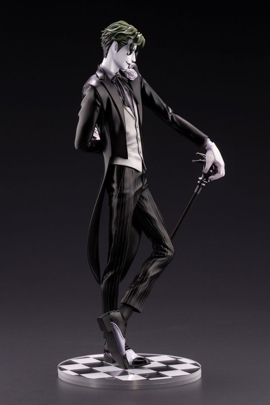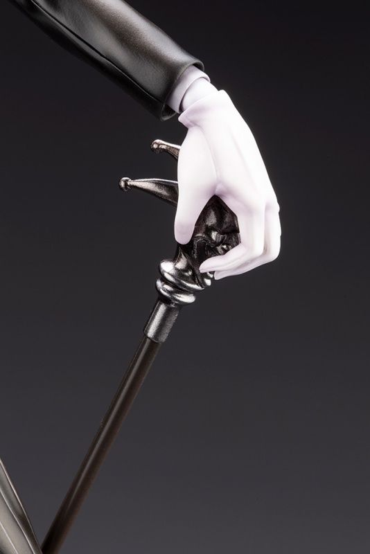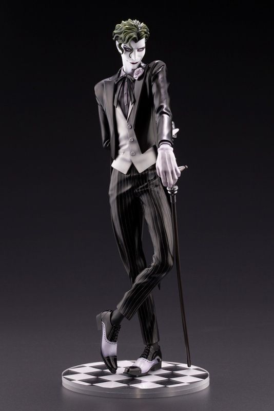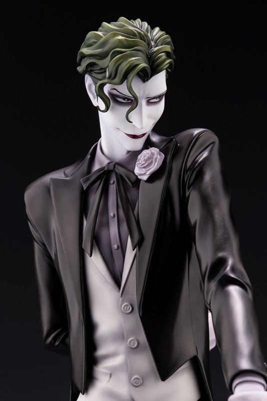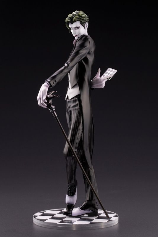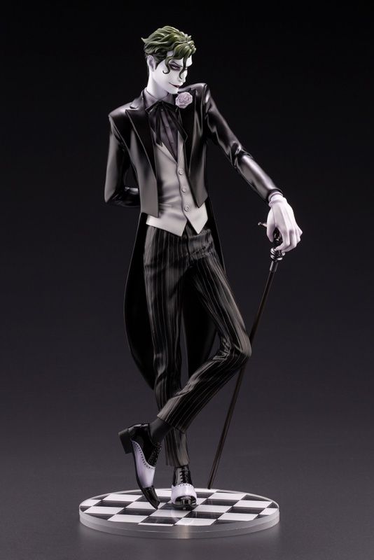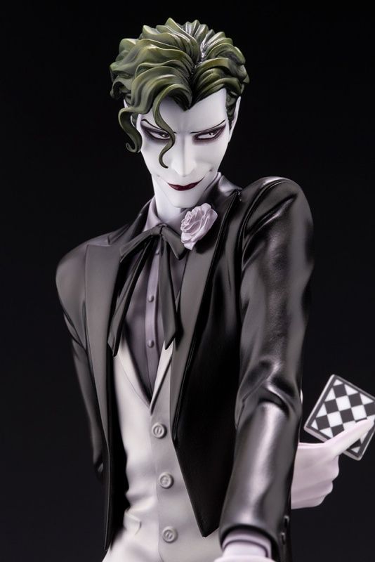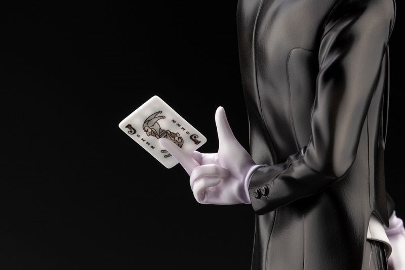 Joker reappears in this limited edition statue exchanging the trademark purple suit for a chic monochrome color tuxedo. Wearing a mischievous grin and holding a long staff and a joker playing card in each hand, this statue perfectly showcases the measures Joker would take to get the final laugh.