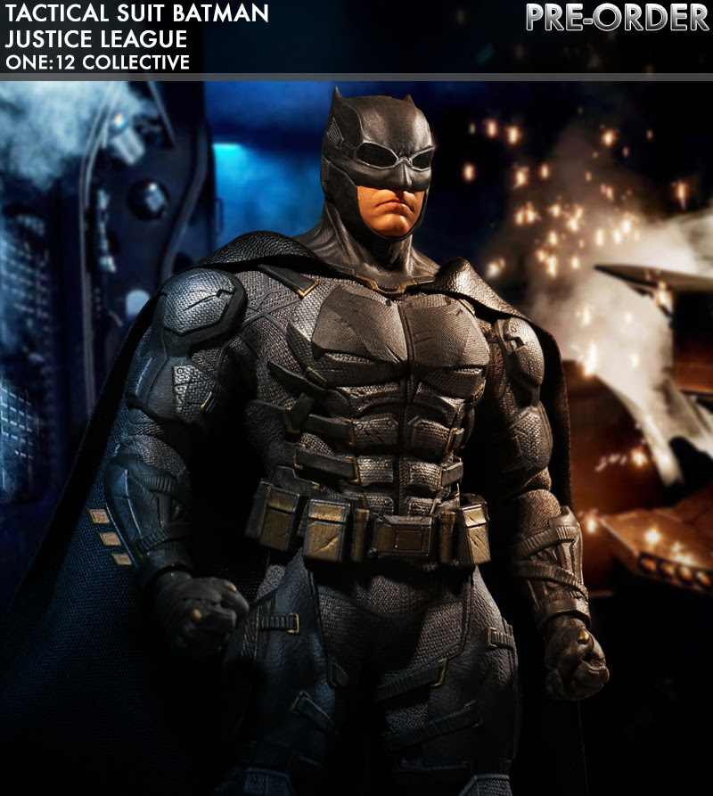 The One:12 Collective Tactical Suit Batman has two head portraits and a newly designed, film-accurate tactical suit.Â
