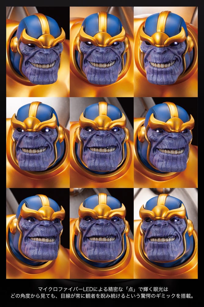 THANOS“ cold and eerie personality can be seen in his facial expression and the six Infinity Gems that shine brightly with an LED light inside of the Infinity Gauntlet. To top everything off, the “eyes”“ are what bring this statue to life.