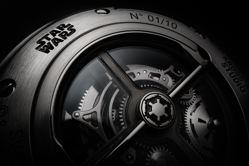 The Death Star-inspired Tourbillon watch itself tells us a great story of passion, craftsmanship and advanced technology. Notable technical innovations are highlighted such as the house-developed manual-winding mechanical movement that delivers a robust 5-day power reserve. The hands have been affixed to a peripheral display that orbits 360 degrees around the tourbillon. A traditional crown system has been replaced by an ingenious, inset push-button system. Kross Studio developed a D-ring shaped crown on the case back for winding the watch, stowed out of sight to help maintain the timepiece’s sleek, space-age styling. These clean lines are also preserved by cleverly hiding quick-release buttons on the underside of the case. This practical feature will doubtless be welcomed by collectors, allowing a quick change of the straps from the included calfskin leather strap to either of the two other included rubber straps.