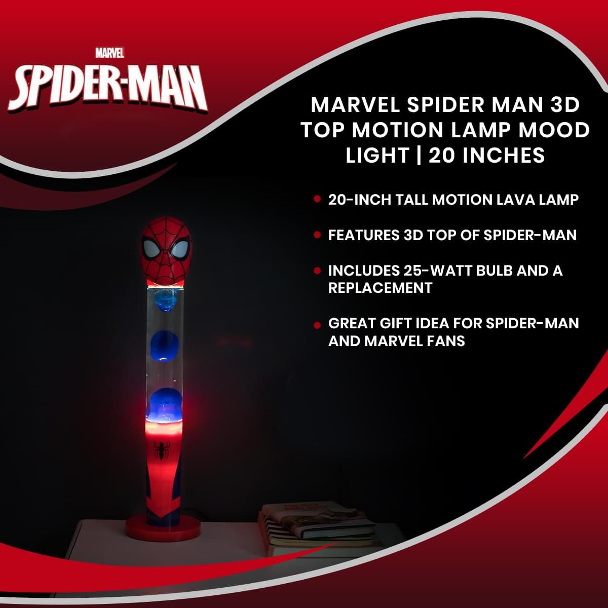 Get inspired by your favorite web-slinging hero with the Marvel Spider-Man 3D Motion Lamp, which stands at an impressive 20 inches tall. The lava-style motion lamp casts a relaxing retro glow and features a colorful 3D design of Spider Man’s iconic mask.