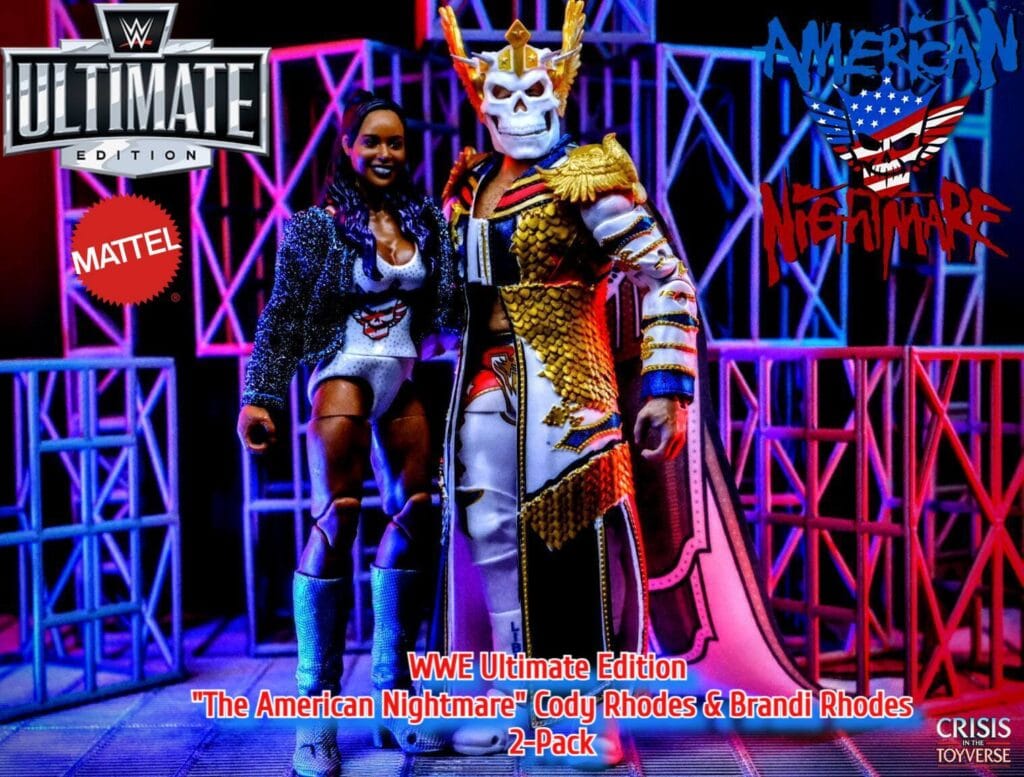 Cody Rhodes and Brandi Rhodes from the Mattel Creations WWE Ultimate Edition 2-Pack – dramatic figure pose with smoke and lights.