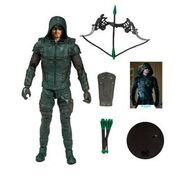 - Green Arrow“s accessories include a bow with knocked arrow and quiver with bundled arrows