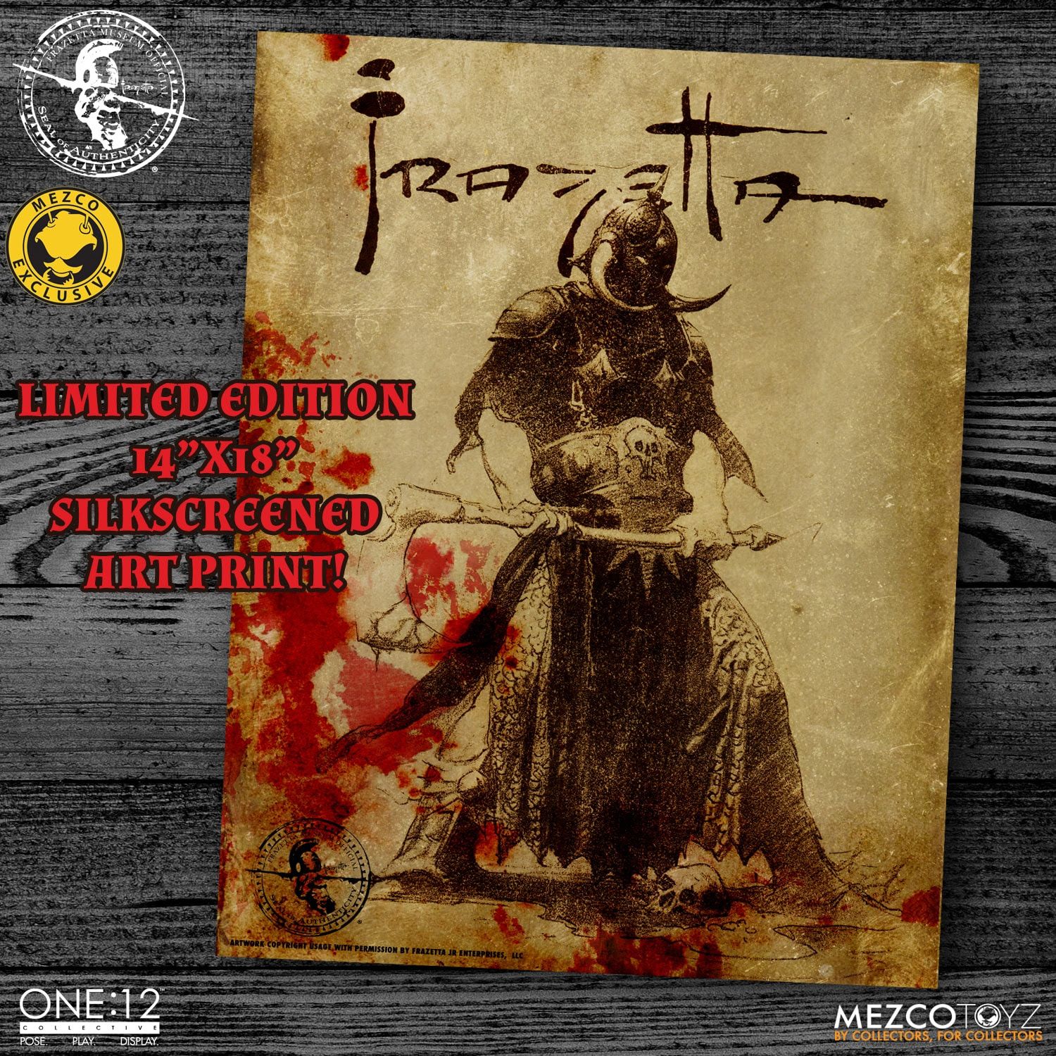 Included in this authenticated vault set is a limited edition Death Dealer One:12 Collective figure, a unique hand silk-screened art print, and pin set – all inspired by the legendary artist“s work and endorsed by the Frank Frazetta Art Museum in PA.