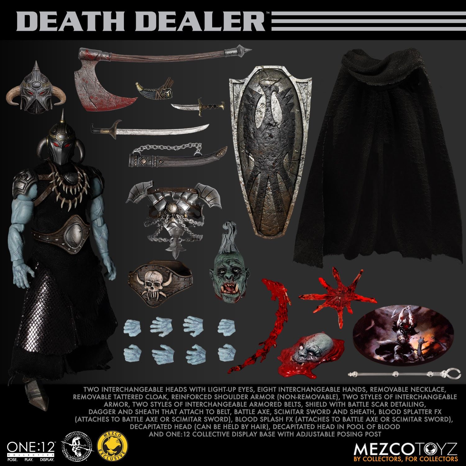 The One:12 Collective Death Dealer includes a range of battle-ready weapon accessories, glowing eyes, and posing FX to invoke the dark atmosphere of the original paintings and illustrations.