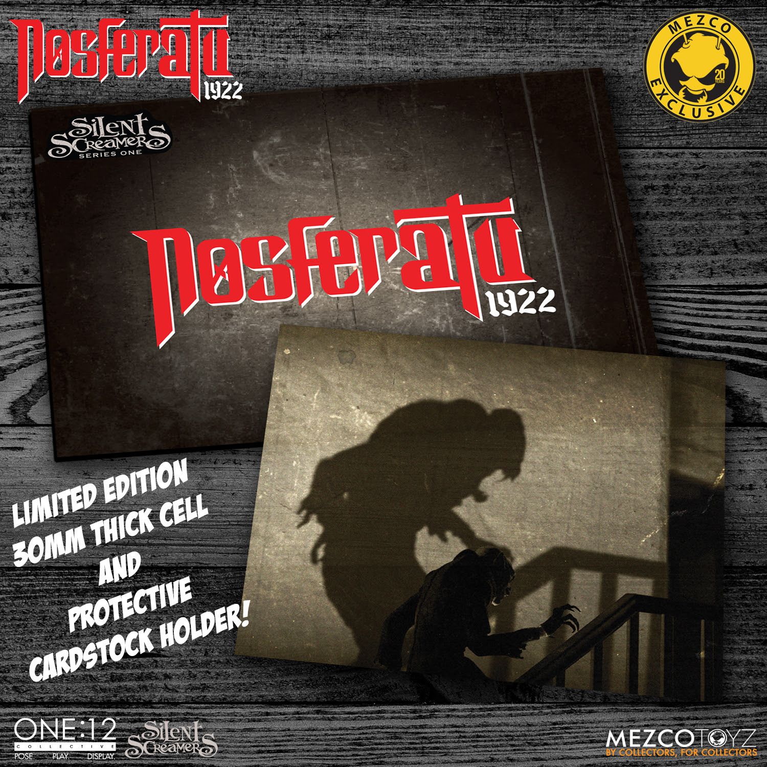 - Nosferatu “Film Cell”“ – a limited edition, 30mm thick cell that features a scene from the stop-motion trailer used in marketing this figure – depicting the Mezco version of the infamous stairway scene. Presented in a protective card stock holder, this unique memento mori is suitable for framing to display in your casket.