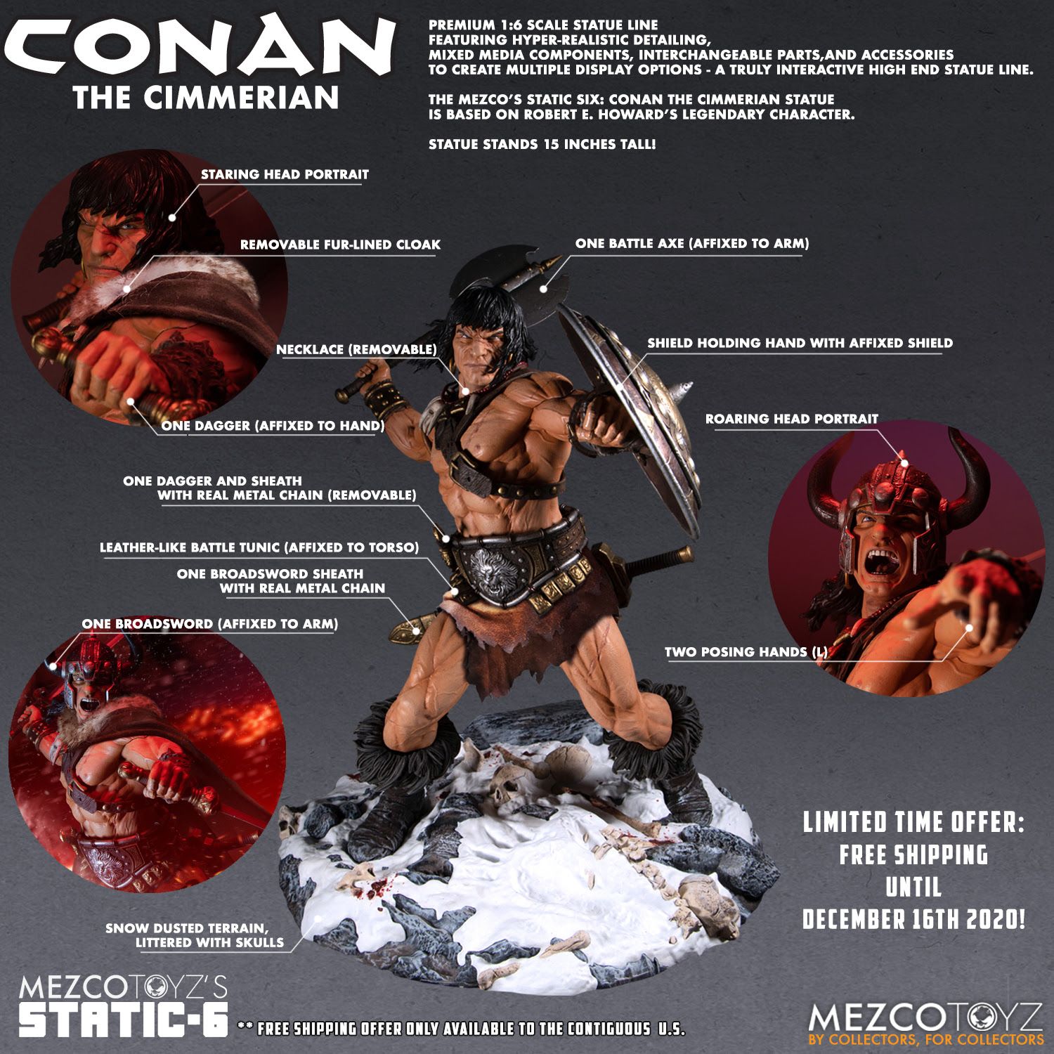 The Mezco“s Static Six: Conan The Cimmerian statue is based on Robert E. Howard“s legendary character. Conan stands atop a snow dusted terrain, littered with skulls at his feet. The Cimmerian is set to strike his enemy, sculpted in a powerful stance wielding weaponry of your choosing. The Mezco Static Six Conan includes two interchangeable heads ”“ a scowling stare and roaring helmeted portrait, as well as interchangeable weapons and arm gestures allowing for a multitude of display options.