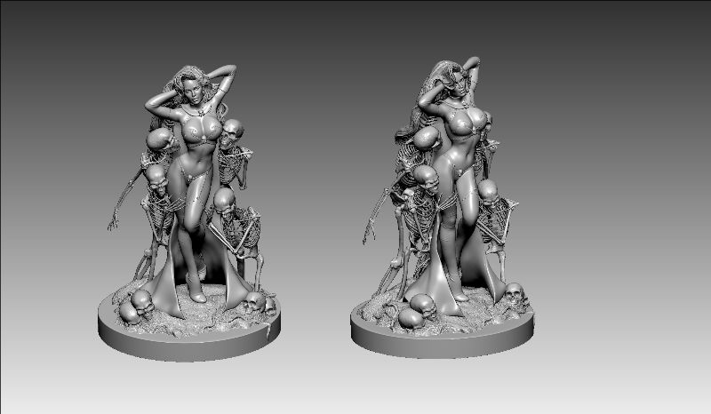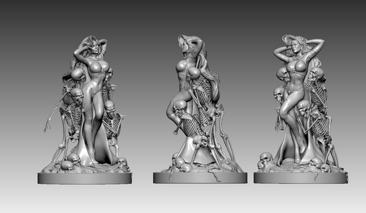 The “Lady Death Reaper Statue” will be a 1:6 scale statue, roughly measuring between 12” – 15”, with the base measuring 10” in diameter. It will include 5 figures, one being Lady Death and the other 4 being skeletons huddled around her.