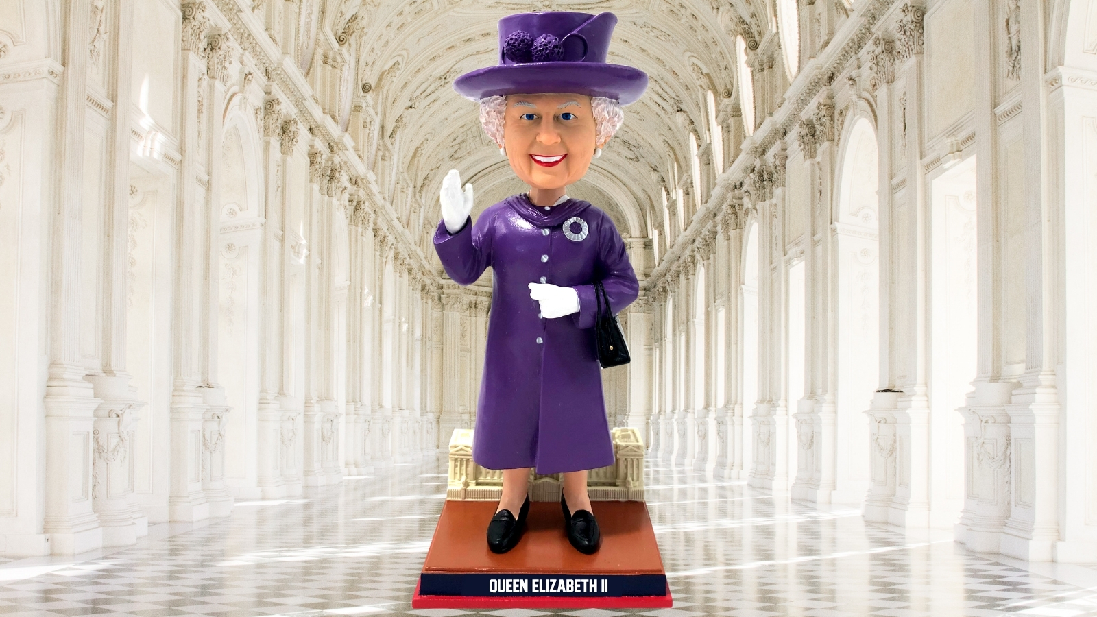 The smiling and waving Queen Elizabeth bobbleheads are dressed in a long coat with a round hat. There is a diamond brooch pinned to her chest. Wearing white gloves, she is holding a black leather bag in the crook of her arm. She is standing in front of a replica of Buckingham Palace and the front of the base says Queen Elizabeth II. The bobblehead is available in eight bright colors: red, orange, yellow, green, light blue, royal blue, purple, and gold.