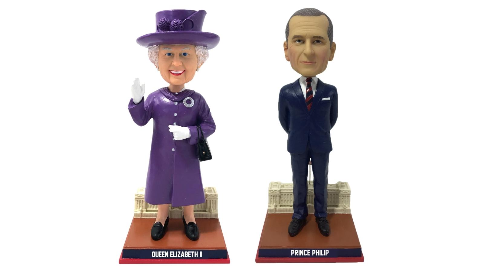 Queen Elizabeth’s bobblehead joins a previously released bobblehead of Prince Philip. Standing with his arms behind his back and wearing a blue suit with a red and black striped tie, the Prince Philip bobblehead is standing in front of a replica of Buckingham Palace. The front of the base says Prince Philip, while the back says Duke of Edinburgh.
