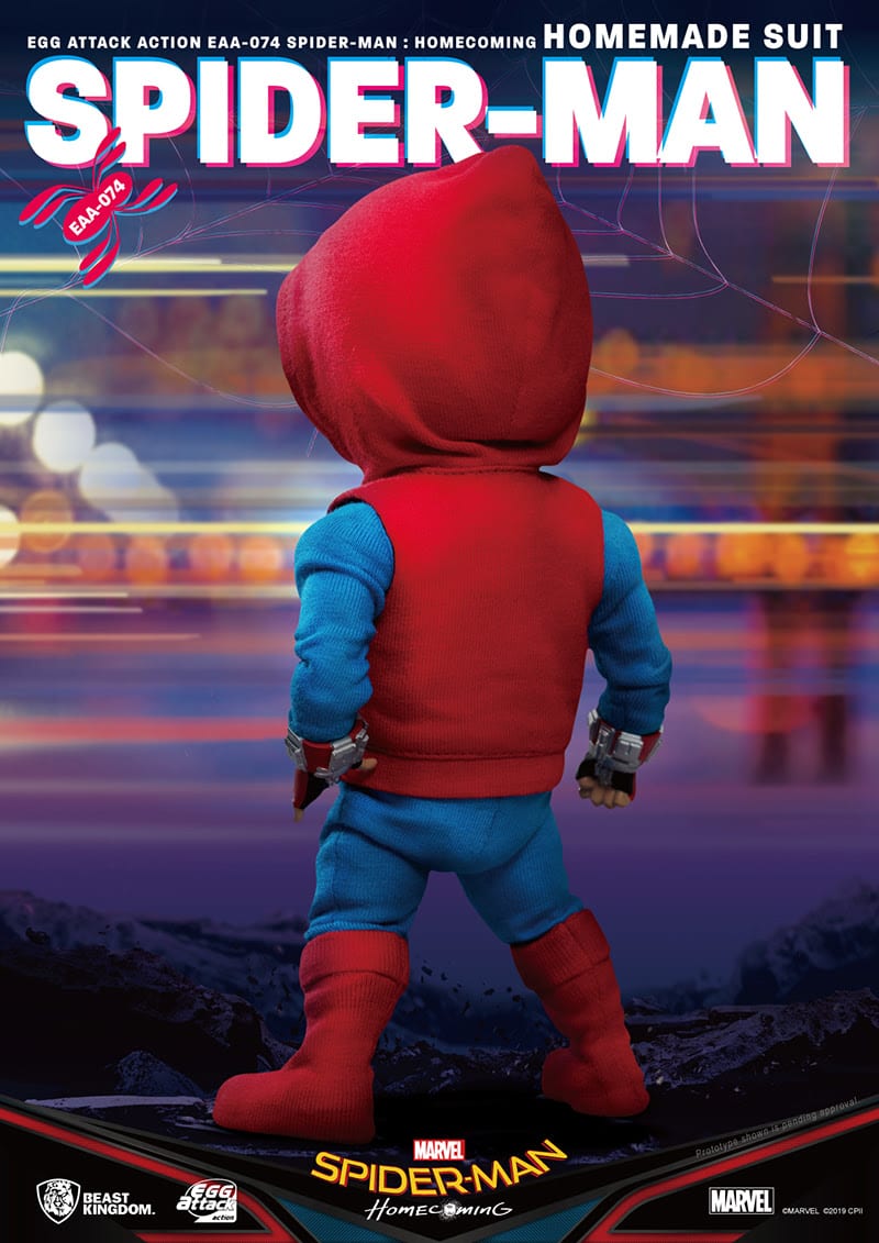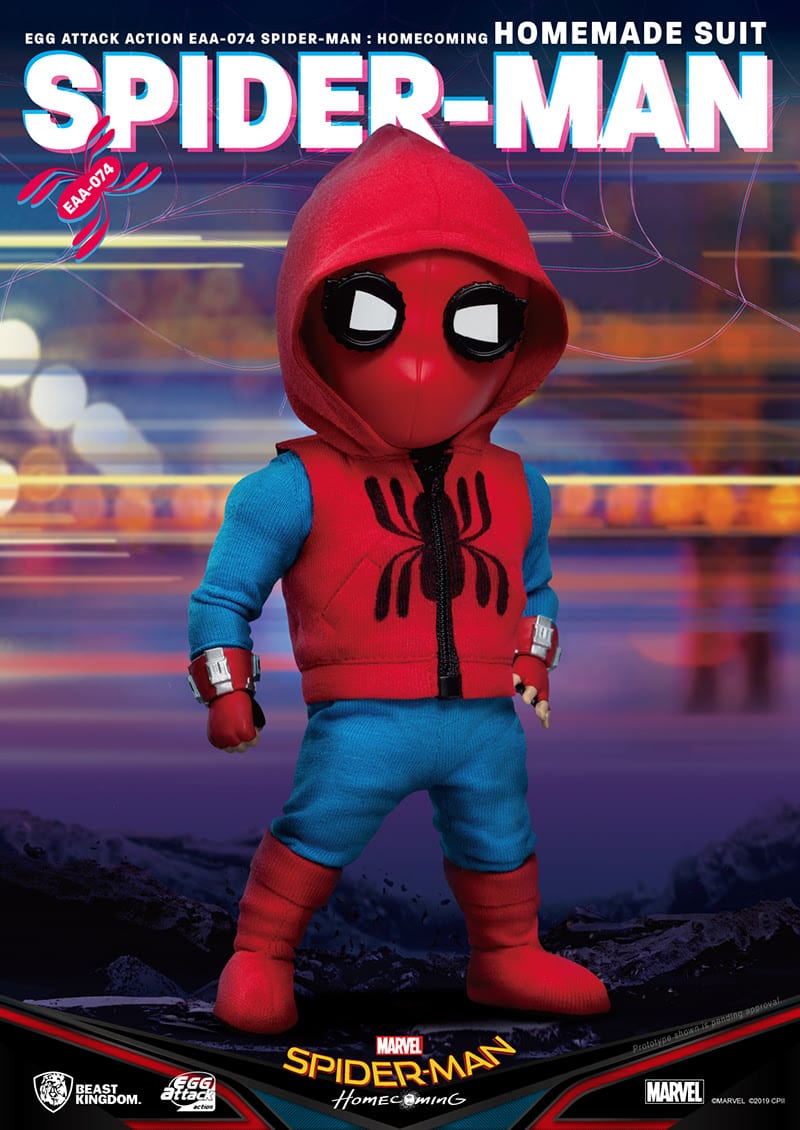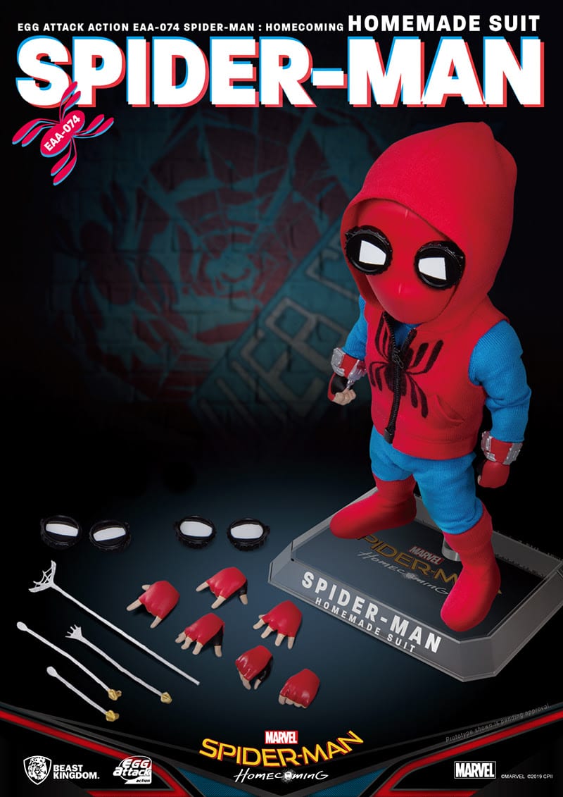 In Spider-Man: Homecoming, Peter Parker goes back to basics and is reminded that even without his advanced spider suit, he is still a hero! Wearing his homemade suit, he still manages to save the day and defeat the conniving Vulture. Beast Kingdom revisits the Egg Attack Action series with the latest cloth-clad 6-inch action figure: PREVIEWS Exclusive EAA-074 Spider-Man: Homecoming Homemade Suit. With a focus on detailed tailoring, this suit is the ultimate homage to Peter Parker“s very own ingenuity. Featuring 28 points of articulation and measuring about 6.5”“ tall, this action figure features not only 3 pairs of magnetic replacement eyes and 4 pairs of replaceable hands, but also a fully tailored suit with elasticity in the pants and t-shirt. Real fabric with real zippers makes this a perfect collector“s piece. Spidey also includes four varying lengths of webbing effects and aHomecoming branded base for easy display.