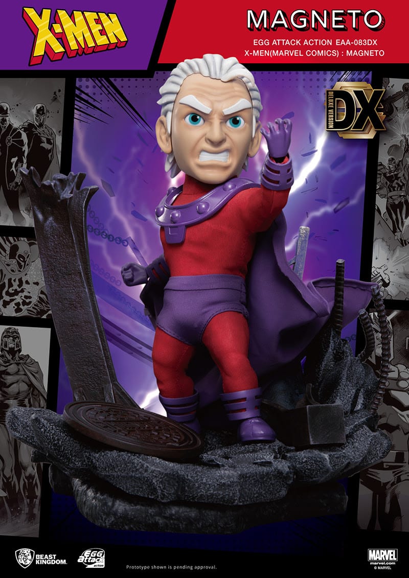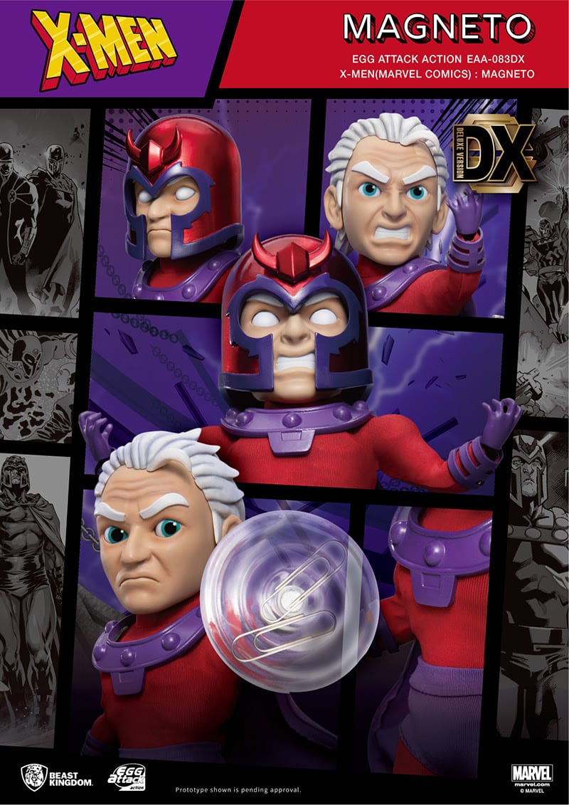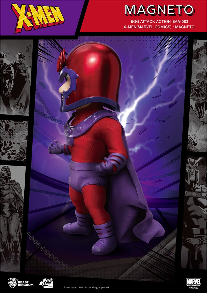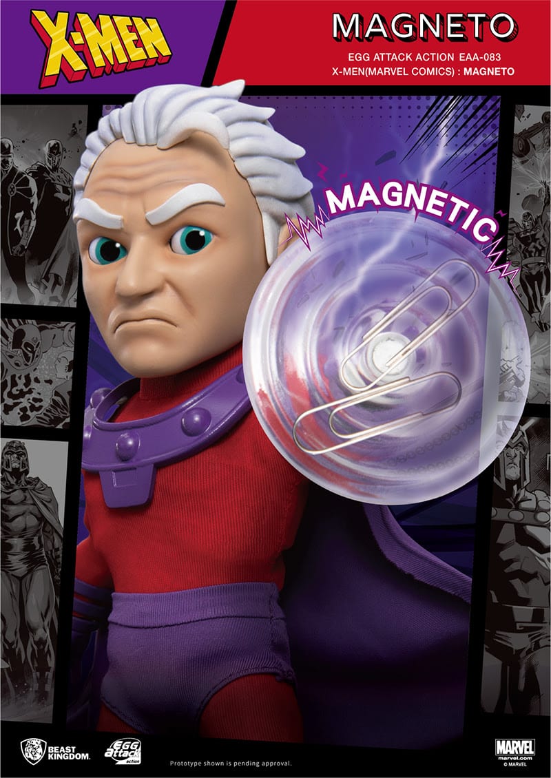 The Marvel Animated series from the 90“s introduced fans to some of the most iconic character designs of all time, and now, following the release of the popular Egg Attack Action Wolverine and Cyclops comes arguably their most infamous foe: Magneto! This highly articulated 6″ PREVIEWS Exclusive EAA-083 X-MEN Magneto figure includes a magnetic helmet to protect Magneto from Professor X“s brainwave manipulation. With a focus on detail, the helmet has high grading paint-work using metallic like effects along with an impressive cloth costume that includes a cloak with adjustable built-in wiring, for the ultimate in possibility. Magneto even comes with effect accessories that include magnets built in for authentic magnetic action! Also included are two replacement faces, three pairs of replacement hands, a pair of magnetic Shock Wave special effect accessory discs, and one X-Men branded platform stand.