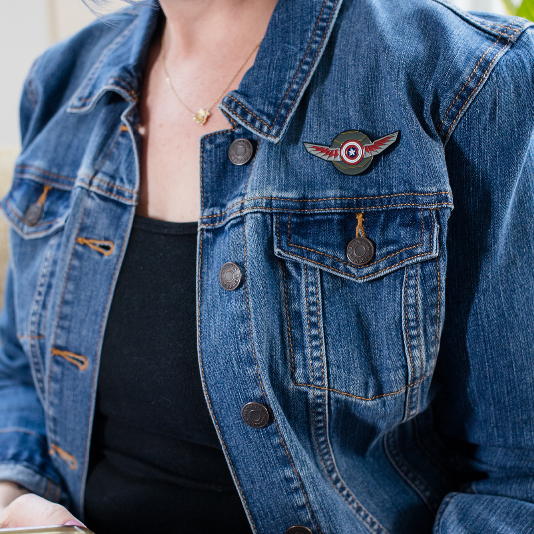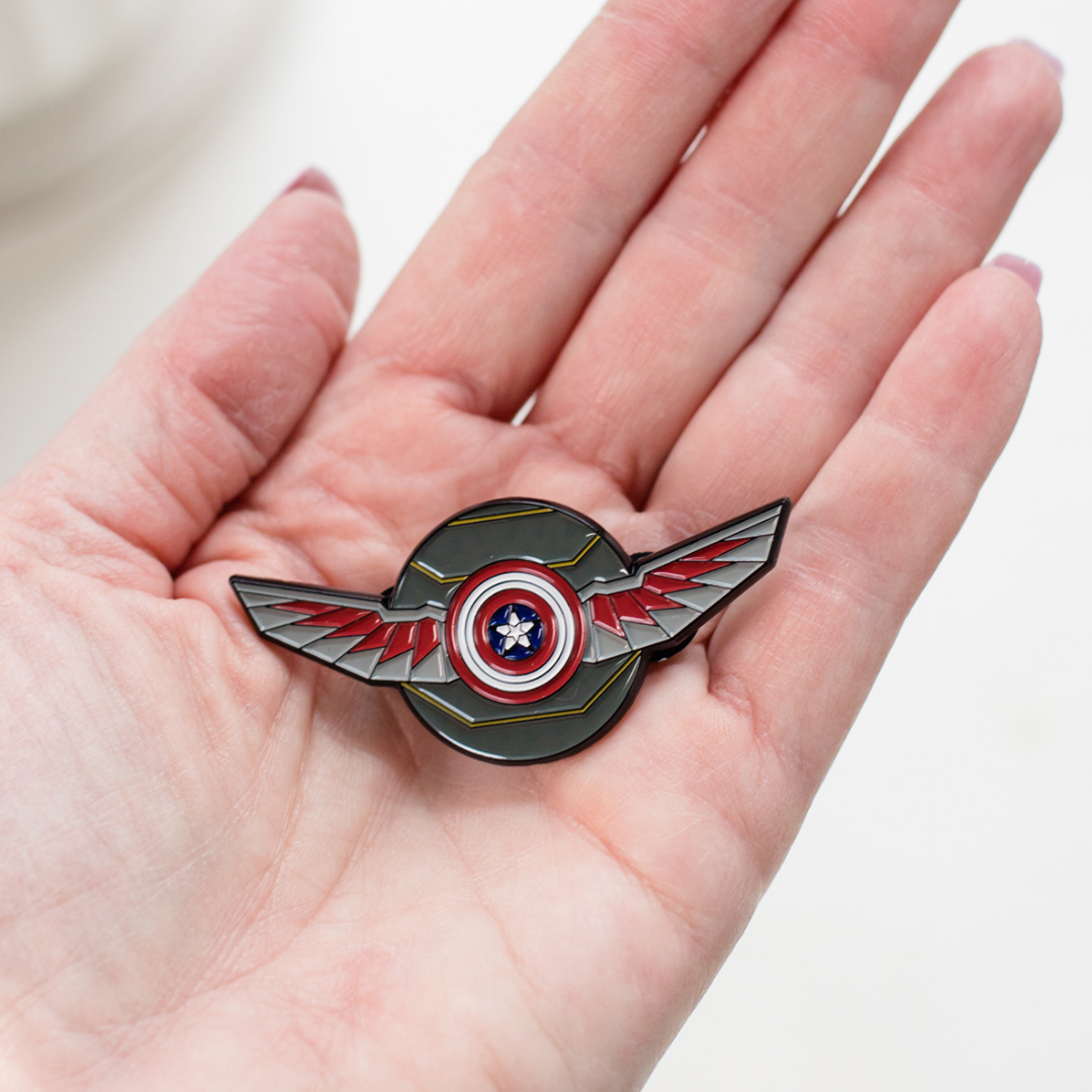 On top of the Winter Soldier’s iconic armor, lie the wings of the Falcon, affixed in the middle of the pin is the iconic shield of Captain America. The durable base metal pin is colored with enamel inlay. The pin measures approximately 1 inch (2.6cm) tall x 2 inches (5.8cm) wide. Dual pin backings help to provide a sturdy hold. Display this enamel pin to your jacket, bag, or corkboard to bring some awesome Marvel energy to your space!