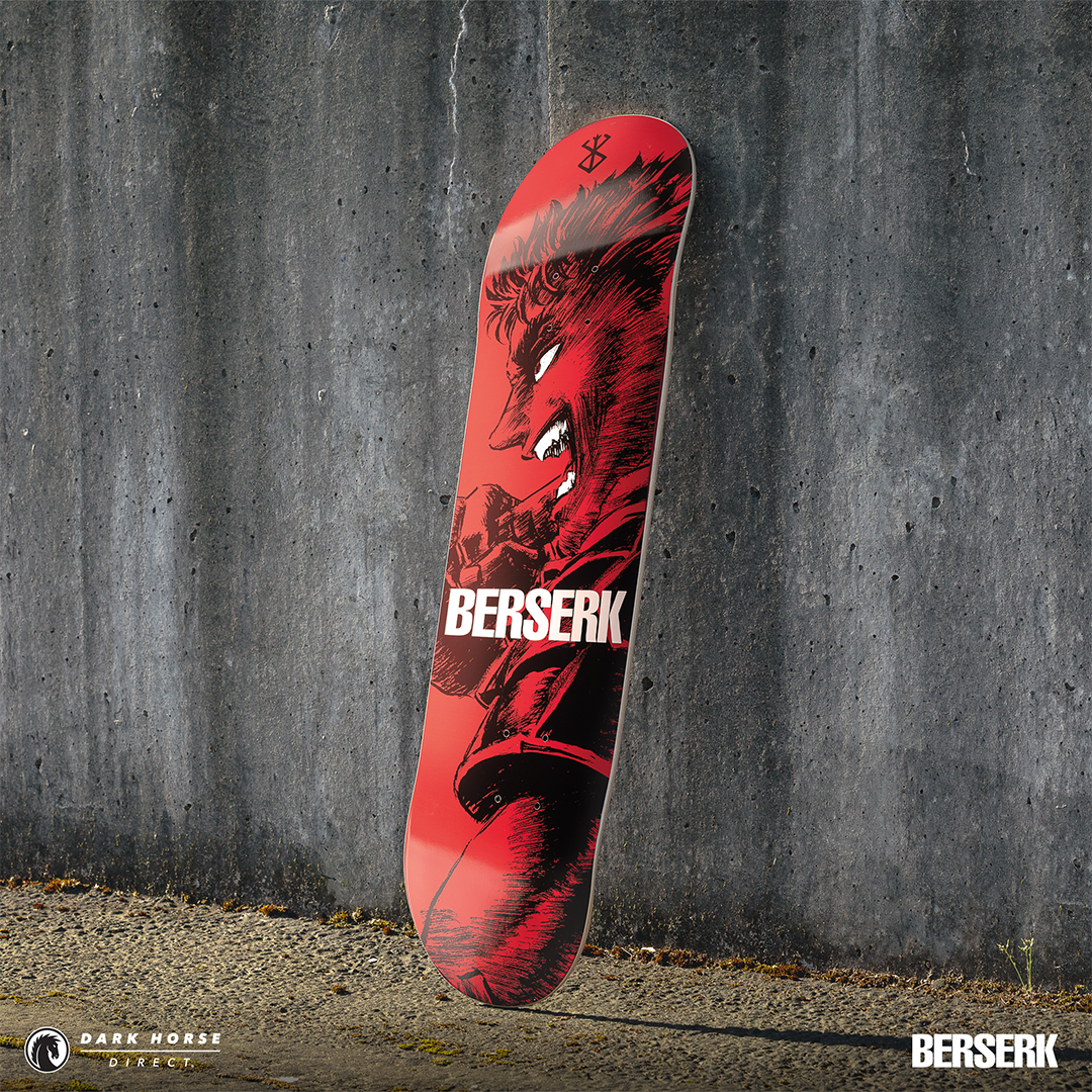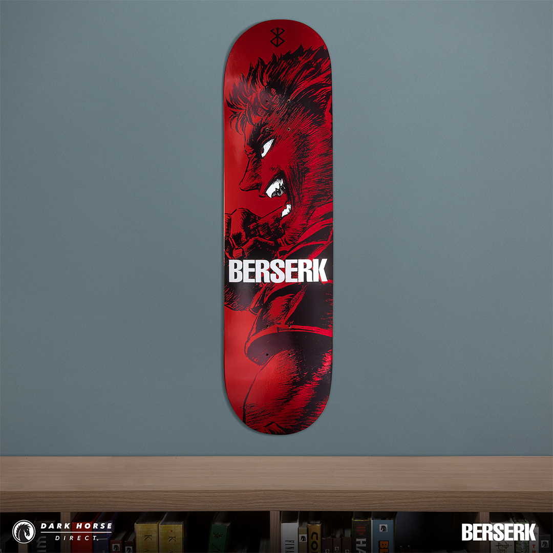 Dark Horse proudly presents the Berserk Skate Deck Guts’ Rage in both a standard and foil print variant. Available via pre-order exclusively through Dark Horse Direct, these decks are inspired by a single page panel from volume 7 by the legendary Kentaro Miura. These skate decks bring Guts to life as he leads the Hawks and charges headfirst into the final clash at the Battle of Doldrey, a century-long struggle. The standard version offers a sharp red background, while the foil variant provides a crimson red metallic foil finish. The iconic Brand of Sacrifice can be found in black at the top and Berserk is in bold white lettering across the middle.