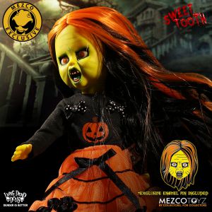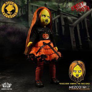 Inspired by trick-o-treaters on the hunt for candy, Sweet Tooth embodies the spirit of Halloween. Every detail, from her orange and black striped stockings, and silk screened pumpkin shirt, to her candy corn shaped teeth, pay tribute to the night that celebrates fear. The back of her sweater has “Living Dead Dolls Halloween 2017” on it, so you can always remember when the wicked little trick-or-treater entered your life. As with all of the Living Dead Dolls she comes packaged in her coffin display, with a death certificate describing her haunting fate.