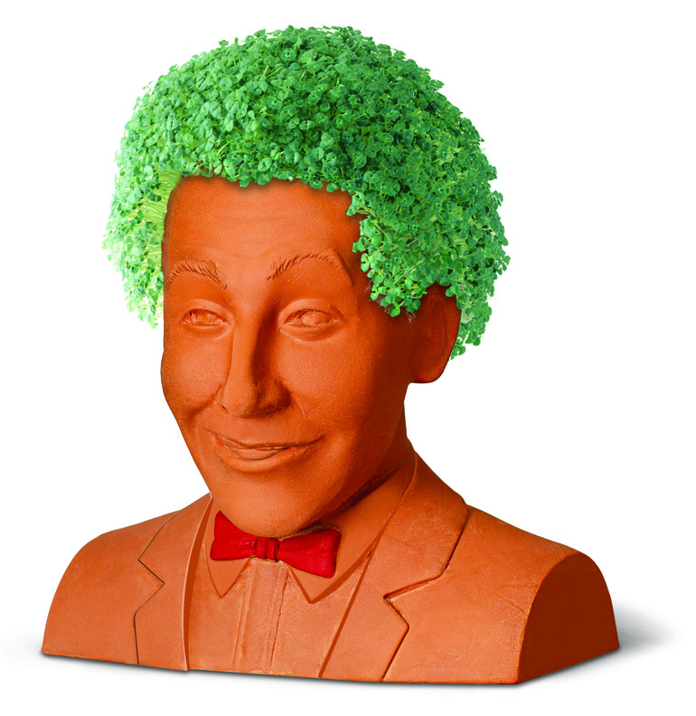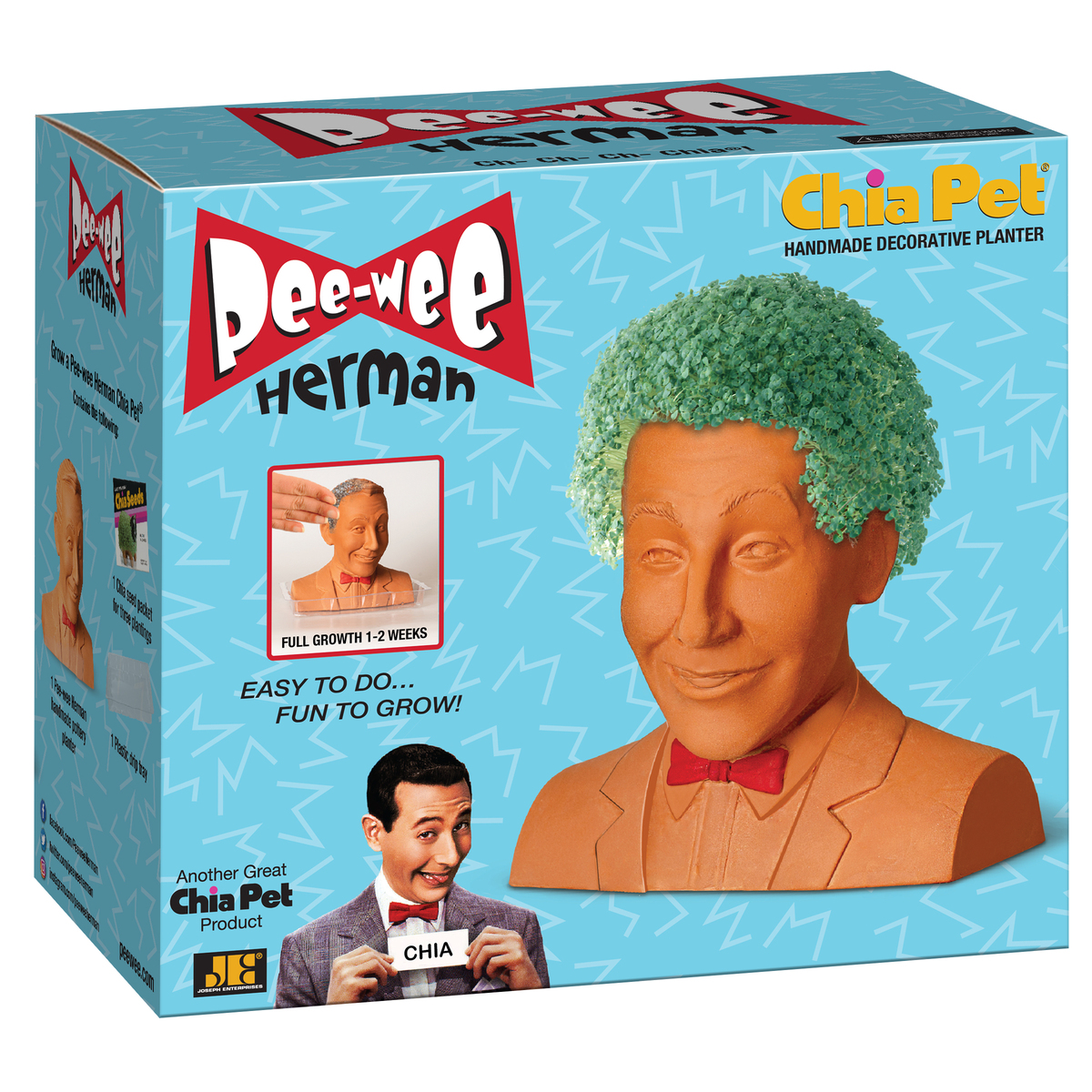 Available exclusively online at Costumes.com and Amazon.com, let the fun begin with the brand-new Pee-wee Herman Chia Pet. Just get those seeds a-mixin’, to Pee-wee’s head you’ll be a-fixin’! Start the water flowin’ and soon the Chia will be a-growin’! As Pee-wee would say, the secret word of the day is “Ch-Ch-Chia!”