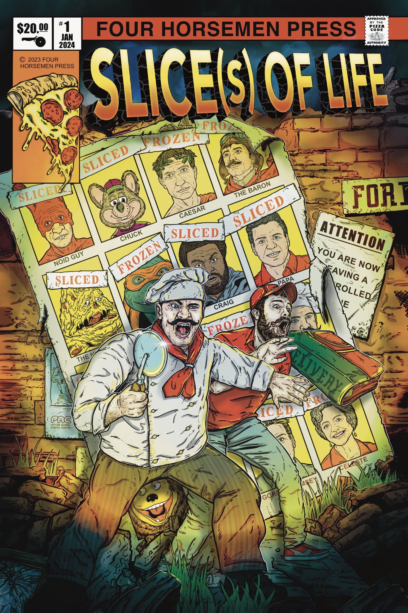 In a terrifying world where the President has outlawed pizza after being ridiculed for eating it with a fork and knife, comes a comedy, drama and noir collection topped with heart and a penchant for pizza. Stories include: No Toppings for Old Men (Mario Candelaria, Laura Helsby, Jao Canola, Scott Ewen), Old Man Gino (Phil Butehorn, Roberto Duque, Scott Ewen), Personal Pan (James Ferguson, Darren Vogt), Pieces (Matt Summo, Jenny Odio, Scott Ewen)—featuring a bonus tale by all four writers, illustrated by Dan Buksa.