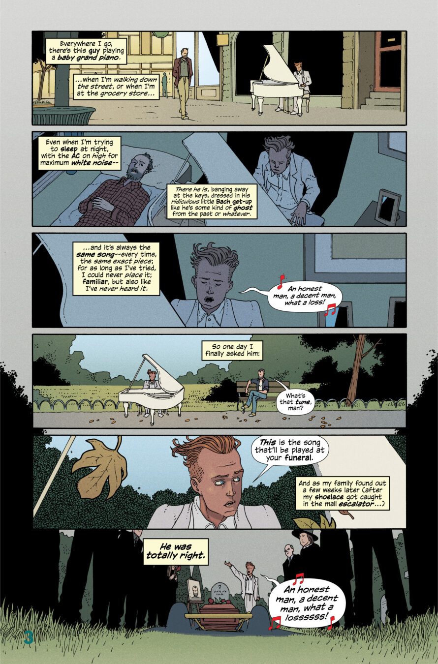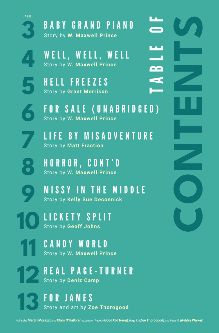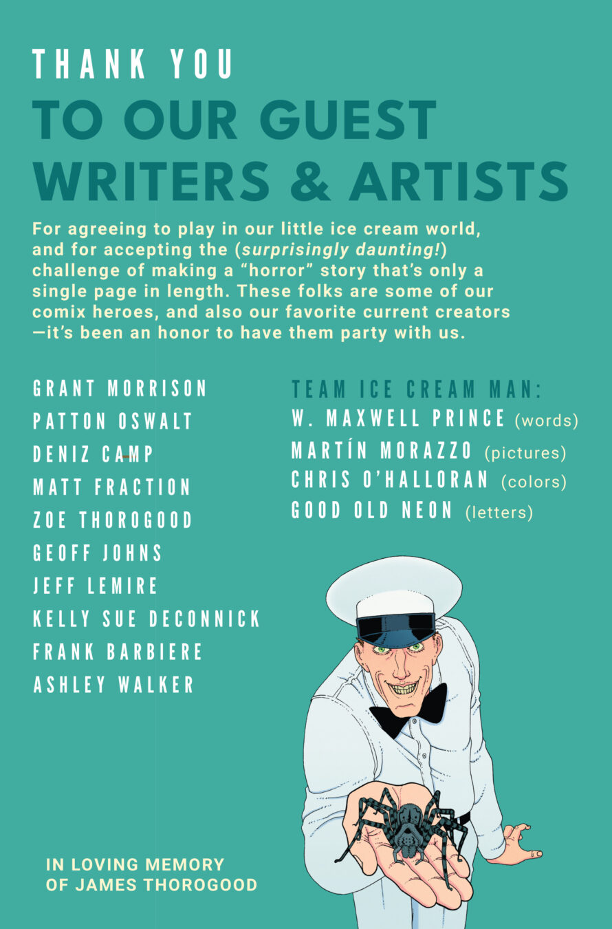 This January, the iconicĀ Ice Cream Man creators W. Maxwell Prince, MartĆn Morazzo, andĀ Chris OāHalloran will be joined by an all-star lineup of creators contributing their own flavors to the cheeky critically-acclaimed anthology horror series for the all-starĀ Ice Cream ManĀ #43, composed of one-page tales of terror. Some of the biggest names in comics, including Grant Morrison, Patton Oswalt, Matt Fraction, Kelly Sue DeConnick, Jeff Lemire, Geoff Johns, Deniz Camp, and Frank Barbiere have crafted their own original stories for the jam-packed edition full of goodies.Ā Ice Cream ManĀ #43 will also feature Zoe Thorogoodās short story āFor James,ā and the issue is dedicated to her brother, with partial proceeds from sales of the issue going to charity on his behalf. And now fans can get an early taste of the comic with a look at the table of contentsāwith the terrifying titles revealedāas well as the full āBaby Grand Pianoā story written by Prince, and panels from Grant Morrisonās āHell Freezesā and Matt Fractionās āLife by Misadventureā stories, all featuring at by Morazzo and OāHalloran.