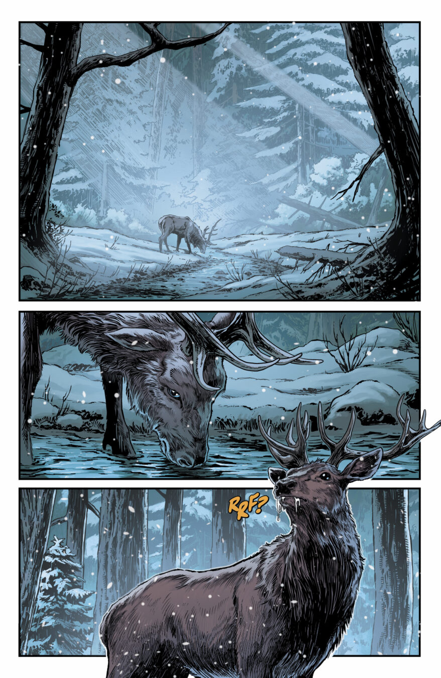 “[Bloodhound has] kind of been driven mad by the instinct influence of his mask,” said Fabok. “Envision the character almost like a rabid dog, like a werewolf. And he’s out there, and he’s kind of stalking the North. We also have a brand-new character that we hinted at in [Rook: Exodus #3] called Stag. He’s searching for Bloodhound as well—but he wants to take his life.”