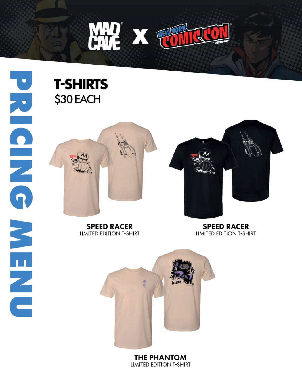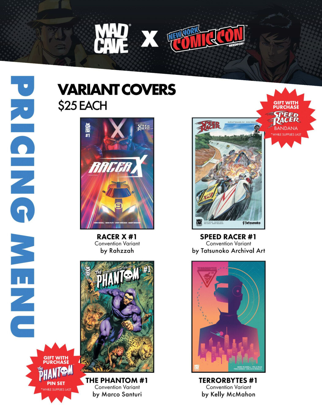 Fans visiting Booth #4455 can grab limited giveaways and convention-only merch all weekend, including debut limited-edition T-shirts featuring Speed Racer and The Phantom, plus exclusive variant covers: Racer X #1 (Rahzzah), Speed Racer #1 (from the Tatsunoko archives), Speed Racer: Tales from the Road #1 (Joe Quesada),The Phantom #1 (Marco Santuri), and Terrorbytes #1 (Kelly McMahon). Receive a Phantom “Mark of the Skull Ring” pin with the purchase of The Phantom convention exclusive, and a Speed Racer bandana with the purchase of the Speed Racer convention exclusive, and free limited Dick Tracy Halloween Special tote bags, while supplies last. Papercutz adds extra treats with a free Miraculous Chibi notebook with any $15 Miraculous Chibi purchase and a free Smurfs bag clip with any Smurfs Archives volume, while supplies last. Throughout the weekend, Mad Cave will also spotlight new, exciting titles and creator signings.