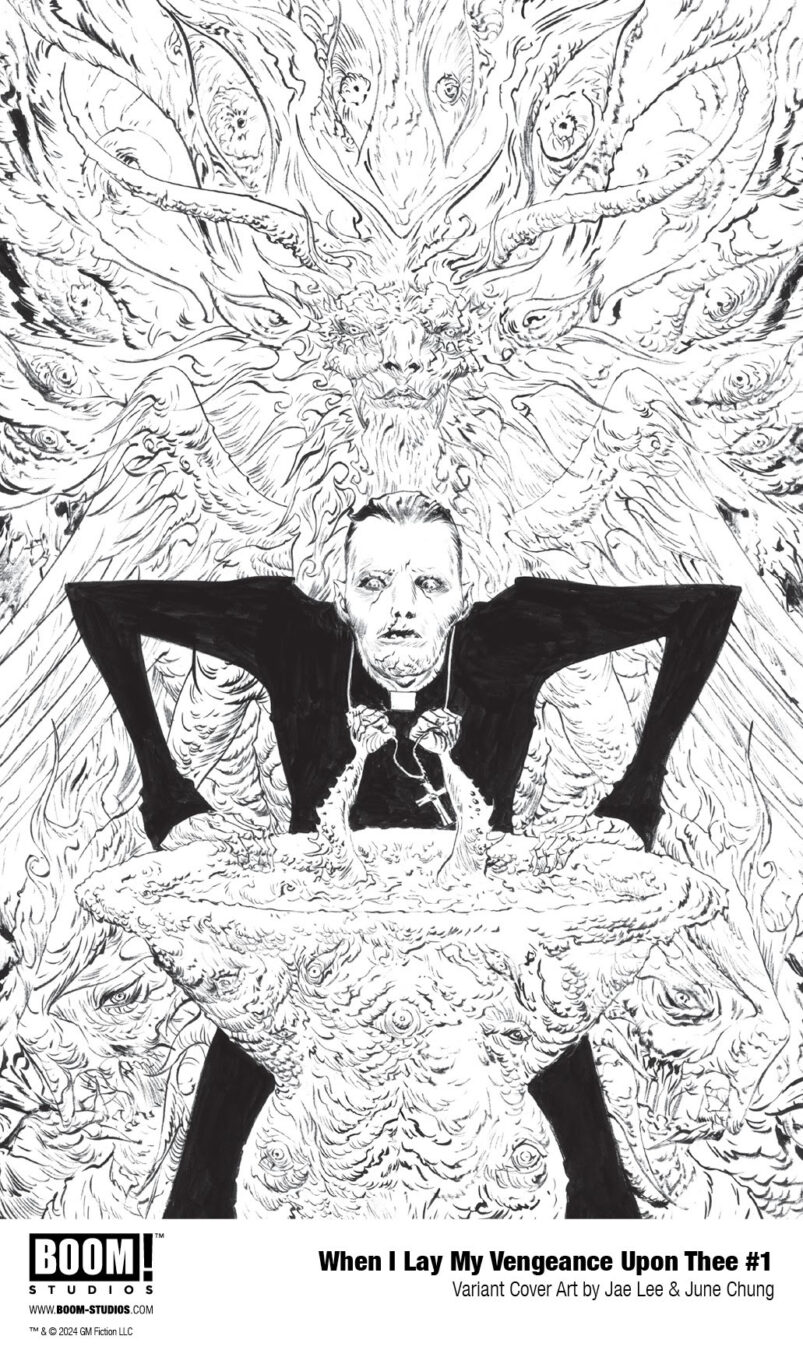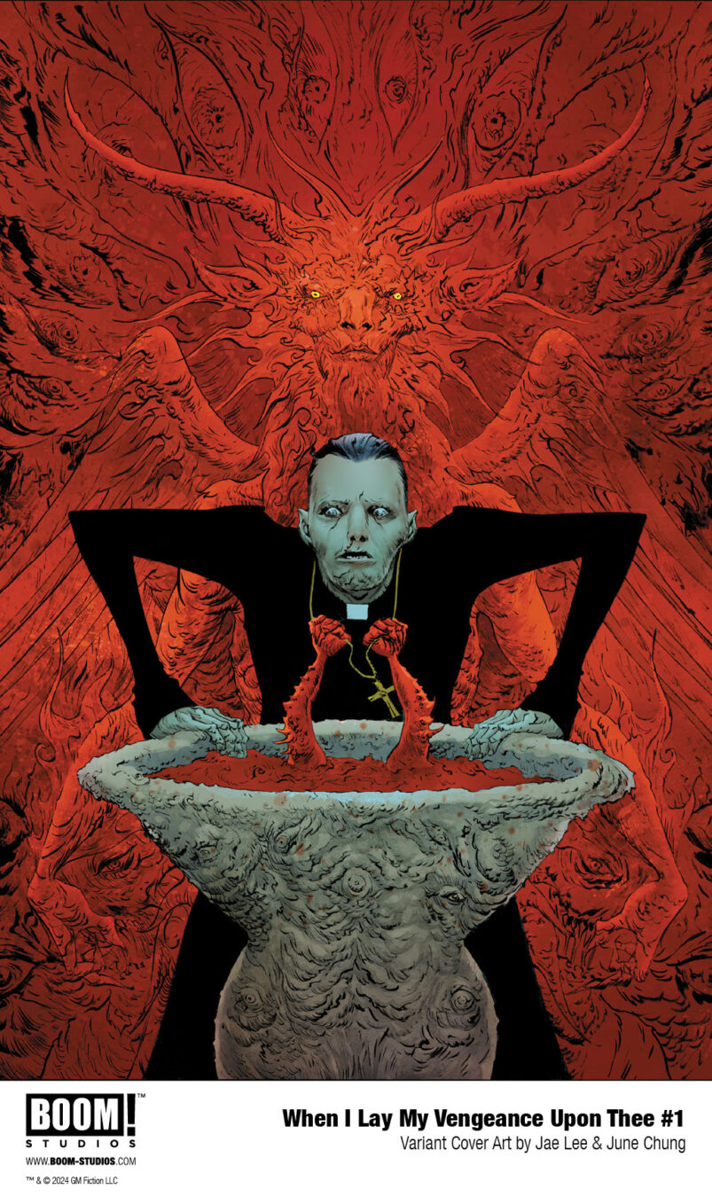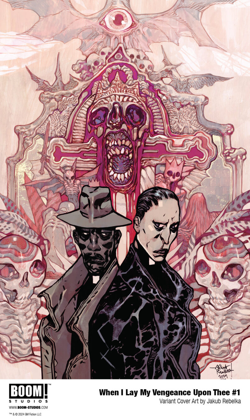 WHEN I LAY MY VENGEANCE UPON THEE #1 features main cover art by series artist Jakub Rebelka, and variant covers by acclaimed illustrators Jacob Phillips (That Texas Blood), InHyuk Lee (Mighty Morphin), Jae Lee & June Chung (The Dark Tower), and a limited BOOM! Studios Direct Reserve exclusive variant by Jae Lee & June Chung!