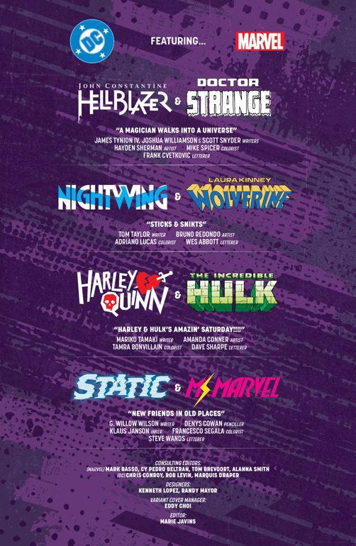 And be sure not to miss these incredible extra stories: Scott Snyder, James Tynion IV, and Joshua Williamson team up with Hayden Sherman for a magical Constantine/Doctor Strange tale! Tom Taylor and Bruno Redondo bring you an epic Nightwing/Dick Grayson and Laura Kinney/Wolverine story! Mariko Tamaki and Amanda Conner smash Harley Quinn and the Hulk together! G. Willow Wilson and Denys Cowan tell an electrifying Static and Ms. Marvel yarn!