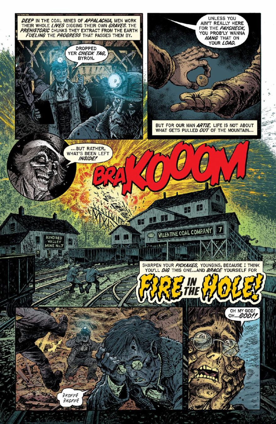 Oni Press, the multiple Eisner- and Harvey Award–winning publisher of groundbreaking comics and graphic novels since 1997, and William M. Gaines Agent, Inc., present to you, fine reader, a first look at “Fire in the Hole” from the upcoming OUTLAW SHOWDOWN #1, on sale October 22. Written and illustrated by the legendary Tony Moore (The Walking Dead, Battle Pope) “Fire in the Hole” relishes in betrayal, death, and dismemberment that you will never be able to unsee. So, if you’re brave enough to look on, do so with caution because . . .