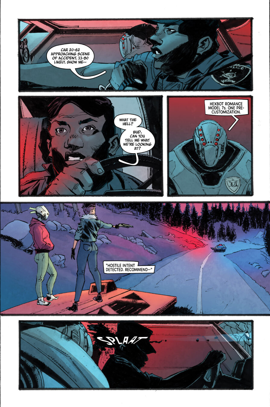 Writer Paul Allor shared, “This is a story I’ve carried in my head for at least a decade, long enough for it to simmer into something more poignant and poisonous than my original conception. We’ve all seen the very real harm of a society that increasingly treats ordinary people as commodities for the ultra-rich and absurdly powerful; a society that measures women, in particular, solely by their usefulness to the men who run everything So, I took my iridescent rage at that and sharpened it into a five-issue weapon: a story of two sex-bots in love, kissing and groping and killing their way across the countryside.”