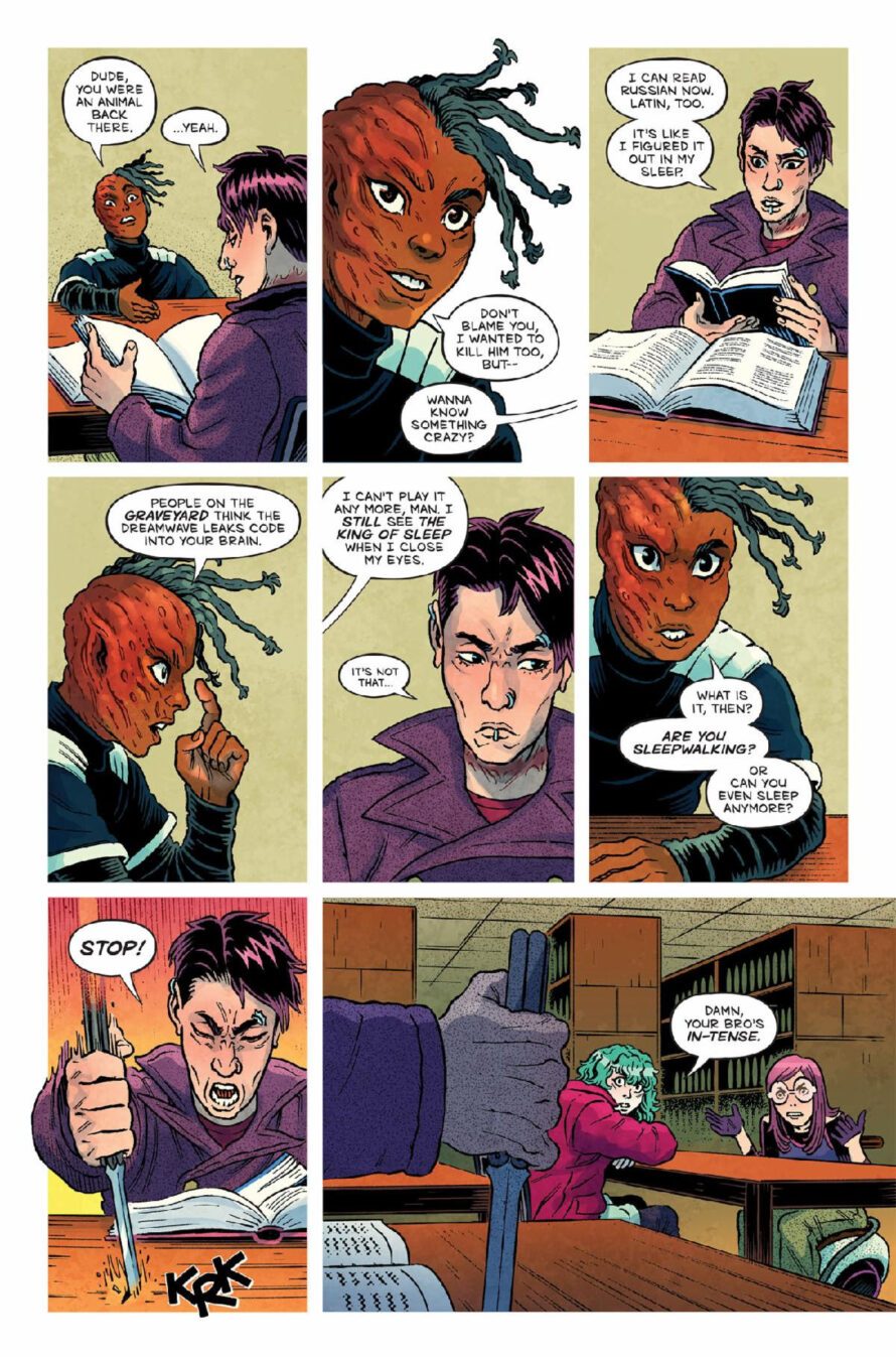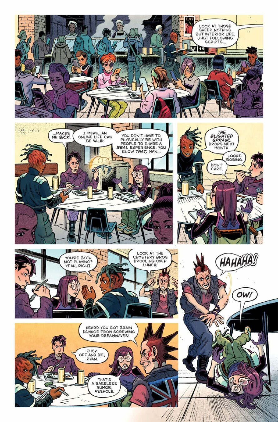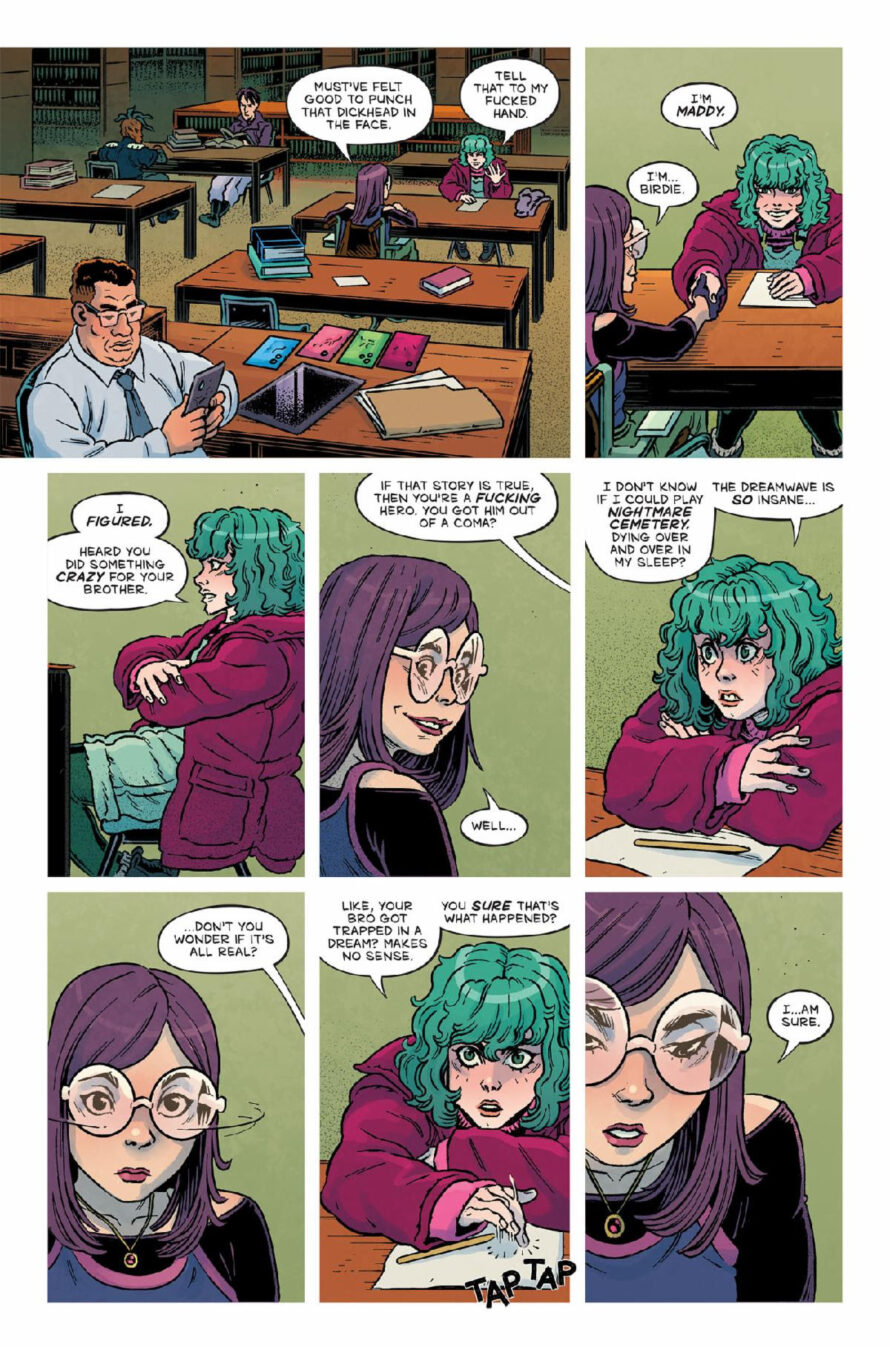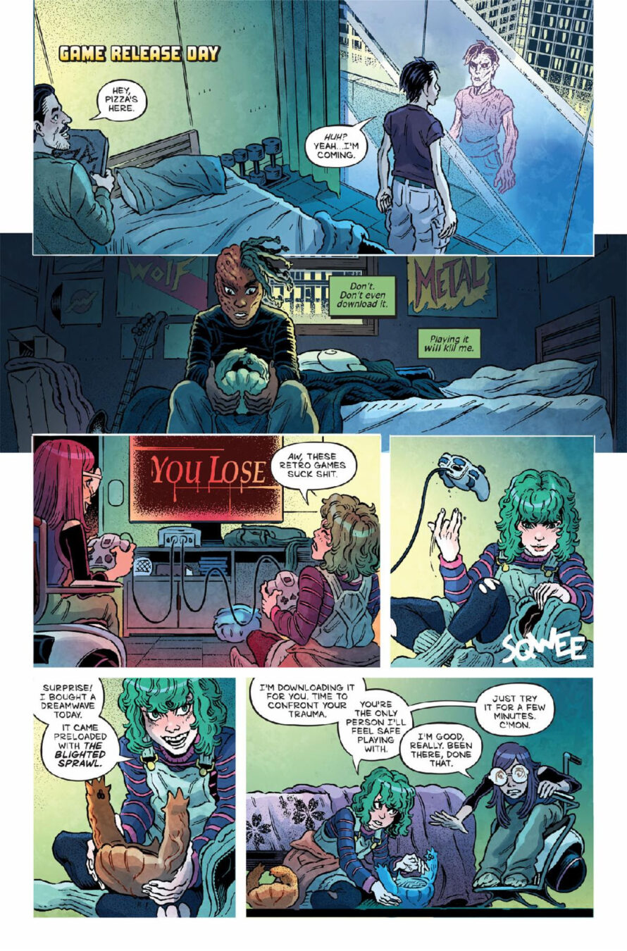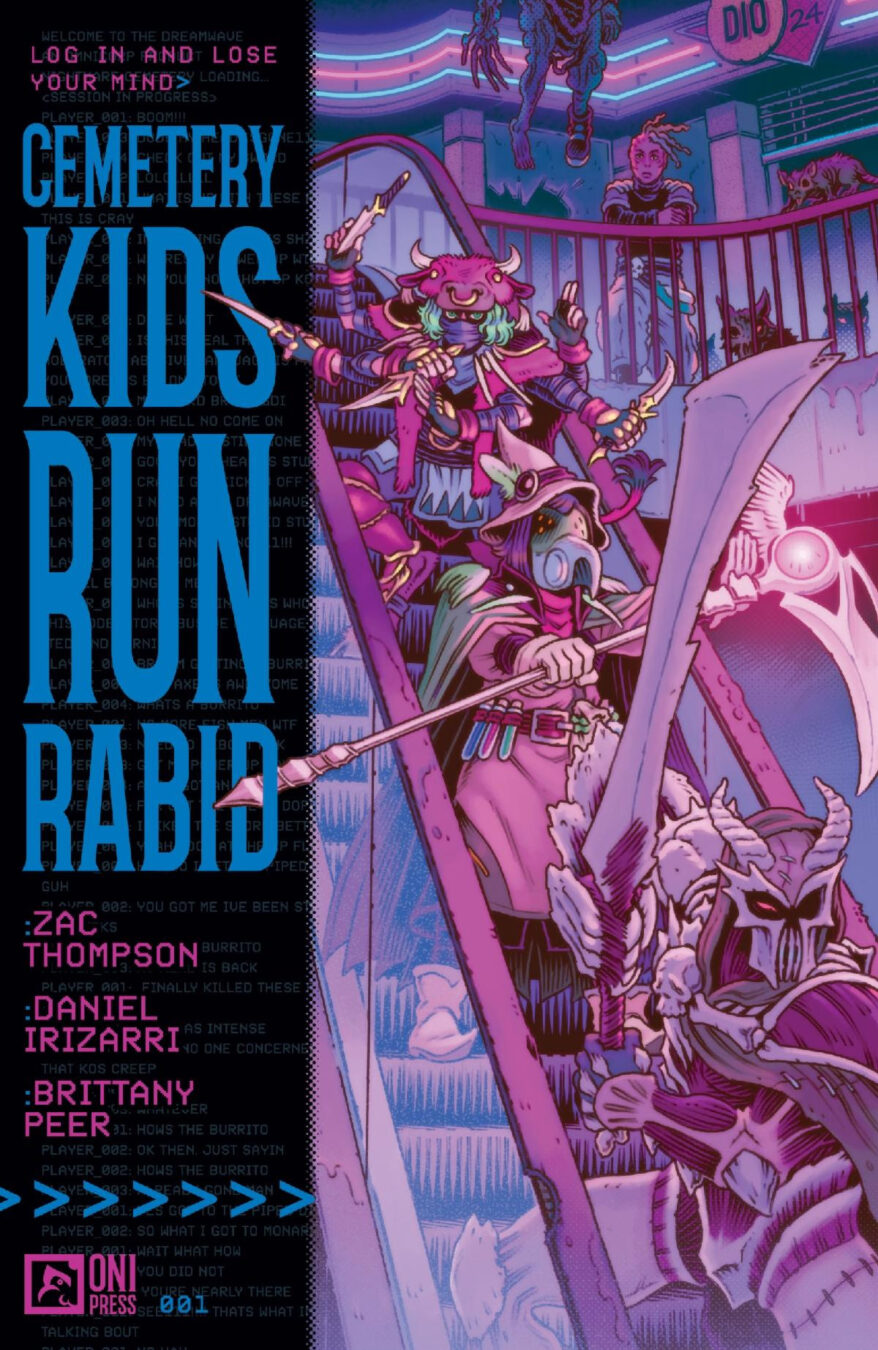 BEING ONLINE PUTS YOUR LIFE ON THE LINE!– Oni Press, the multiple Eisner and Harvey Award-winning publisher of groundbreaking comics and graphic novels since 1997, is proud to present the first look inside CEMETERY KIDS RUN RABID #1 – an all-new jumping point for the serotonin-splattered video game horror hit from Zac Thompson (Into the Unbeing – Parts 1 & 2) and Daniel Irizarri (EC’s Cruel Universe, Judge Dredd) that began with CEMETERY KIDS DON’T DIE! On August 13th, sit back, relax, and surrender your mortal consciousness to the CPU of the Dreamwave – the world’s first video game system played exclusively in your sleep – even though its players sometimes don’t wake up…