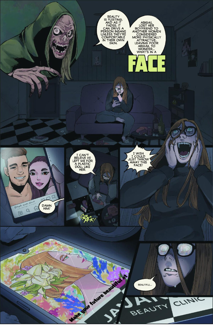 First, from the legendary Mike Carey and Mark Torres comes the horrifying account of a man who loves war but may find that he’s the one truly fighting for his life. Sensational Japanese creator Acky Bright brings his unique, horrific vision to a terrifying tale about how far one woman would go for beauty…