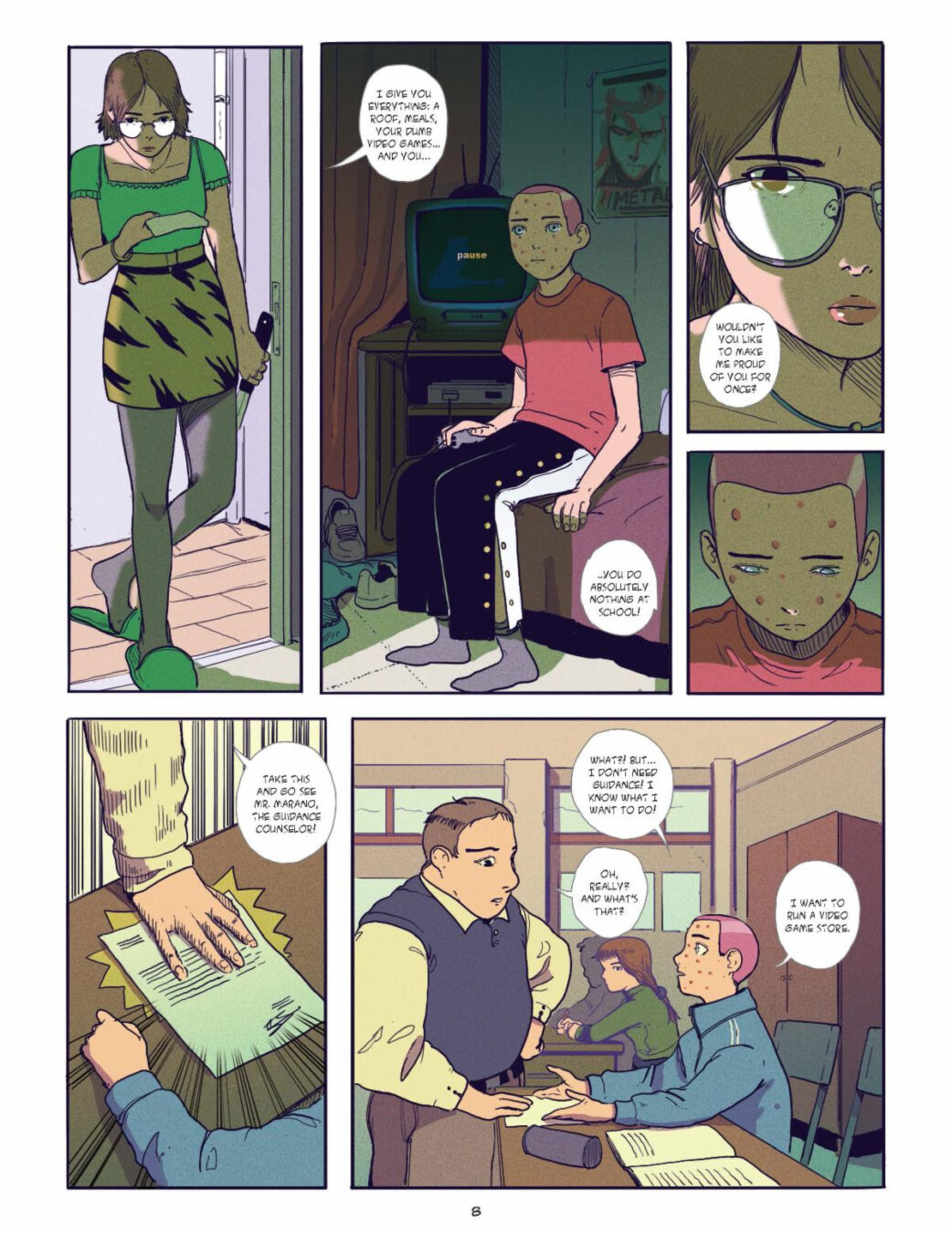 In a world built on conformity, there’s no room for dreamers, but two audacious teens are determined to put that to the test… even if it kills them in INFANTOMS. At school, “Pizza Face” doesn’t exactly shine with his report card. On the contrary, he’s one of the worst dunces in school. He dreams of opening a video game store, but that’s about the extent of his ambition. He’s summoned into the guidance counselor’s office, along with a rebellious girl named Mims. Mims loves manga and doesn’t care about the system. But both of their futures are at stake this decisive year… If they fail, their parents are authorized to literally kill them! The pressure of this strange new policy begins to weigh on the teenagers’ shoulders, and their parents begin to slowly mutate into monsters. Can their parents really kill them if they fail classes? Pizza Face and Mims bond to face this existential threat, but soon the situation spirals out of control, and their race for merit becomes a race for survival, a downward spiral in a conformist world that leaves little room for imagination.