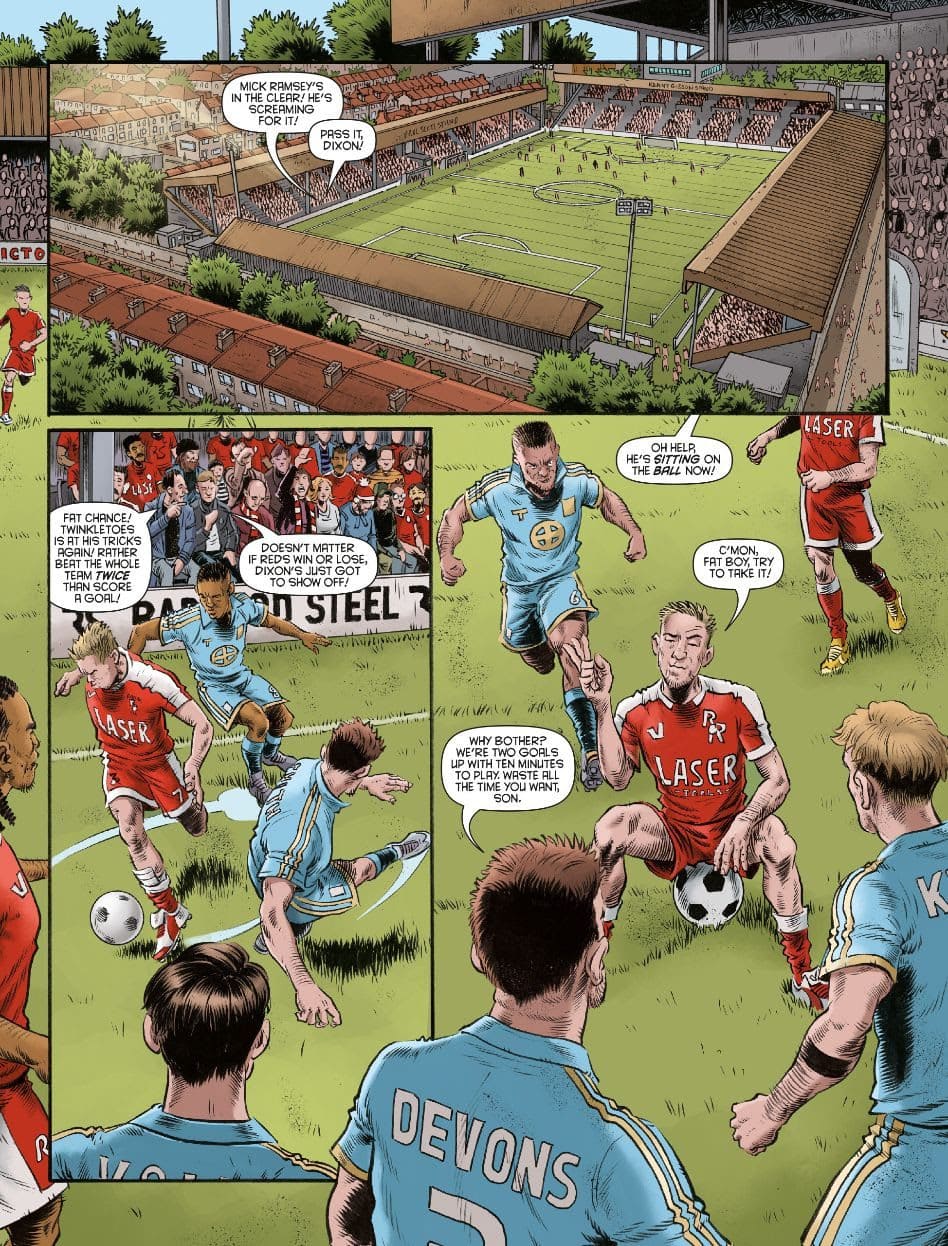 Originally published in two volumes by the trio of Wagner and Cornwell, alongside the late great Alan Grant, Rok of the Reds is a black comedy about revenge, redemption, and relegation. It follows Rok of Arkadi, an alien who seeks refuge on Earth after his homeworld is destroyed by bounty hunters. However, his attempts to hide under the radar are complicated when he has a chance meeting with arrogant young footballer Kyle Dixon, a bad boy who has been causing problems for his struggling team.