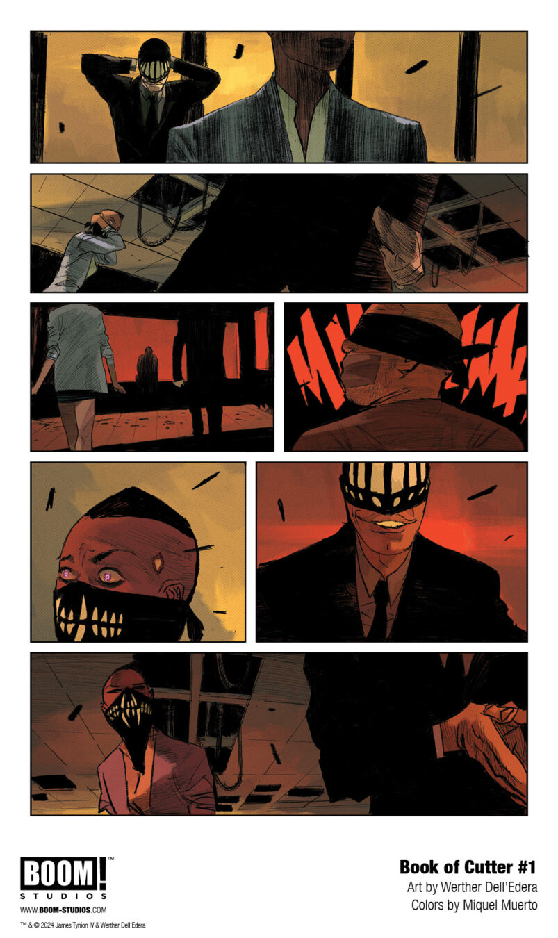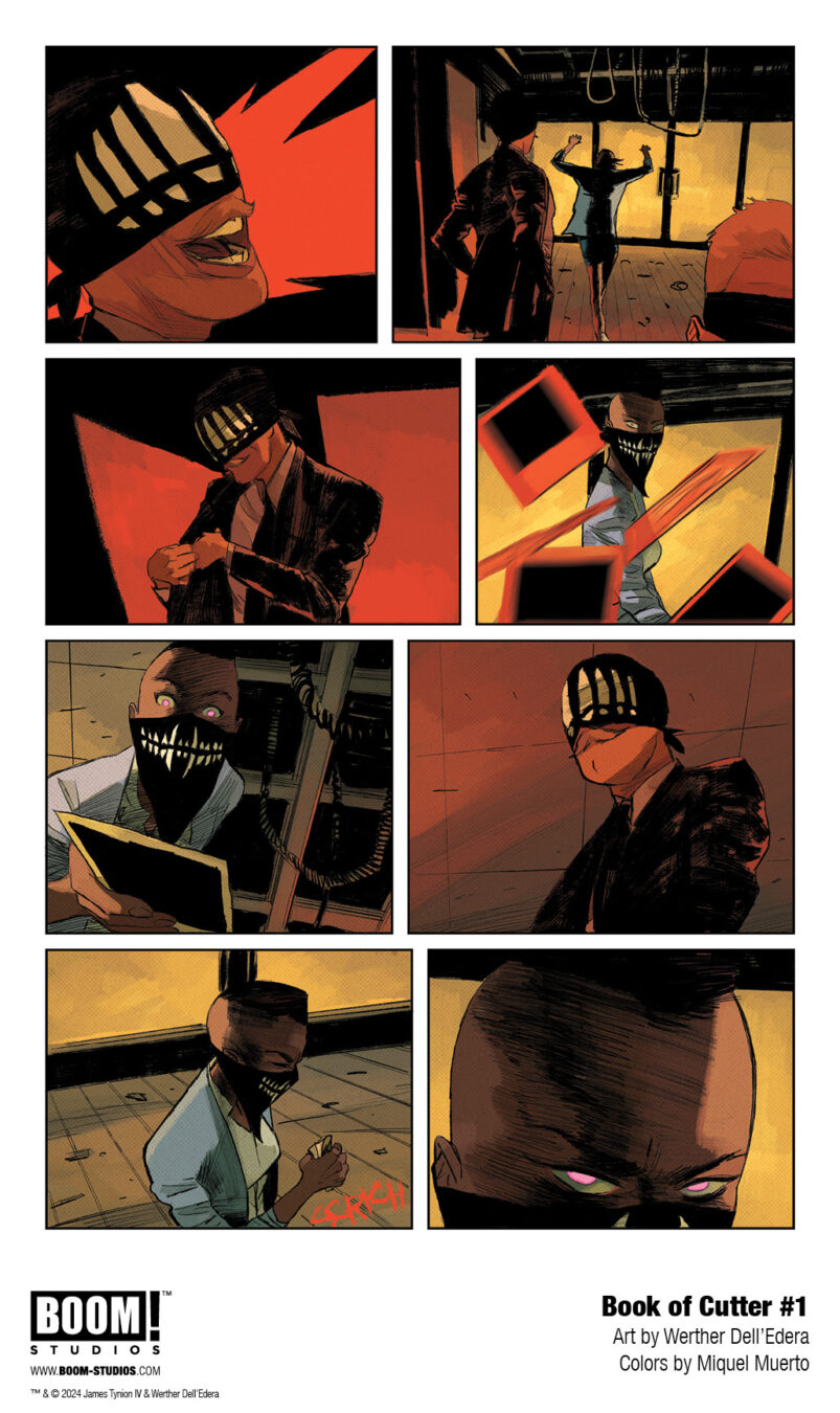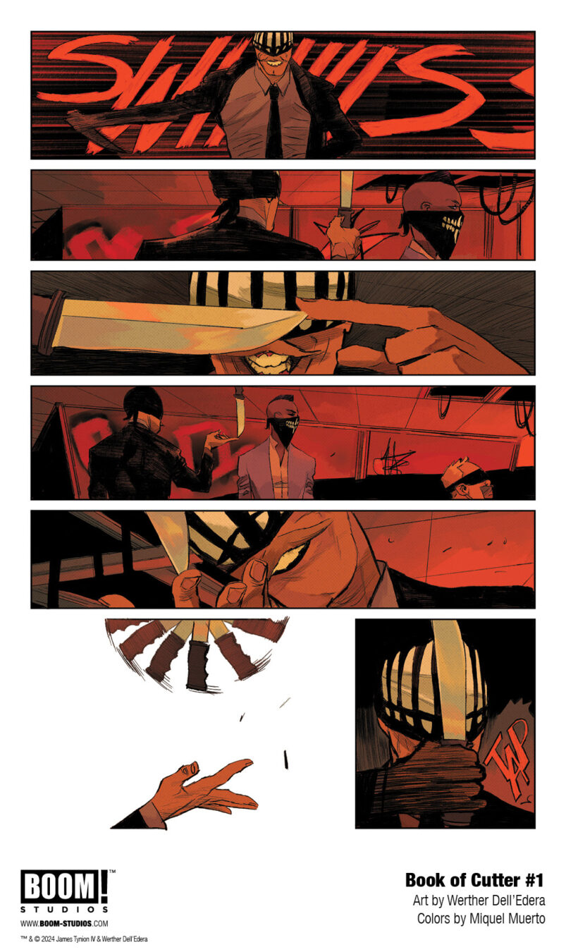 BOOM! Studios revealed today a first look at BOOK OF CUTTER #1. The epic conclusion to Maxine Slaughter’s transformation from White Mask to Black Mask in BOOK OF CUTTER, by writer James Tynion IV, artists Werther Dell’Edera, Antonio Fuso, and Letizia Cadonici, colorist Miquel Muerto, and letterer AndWorld Design, hits shelves January 2025.