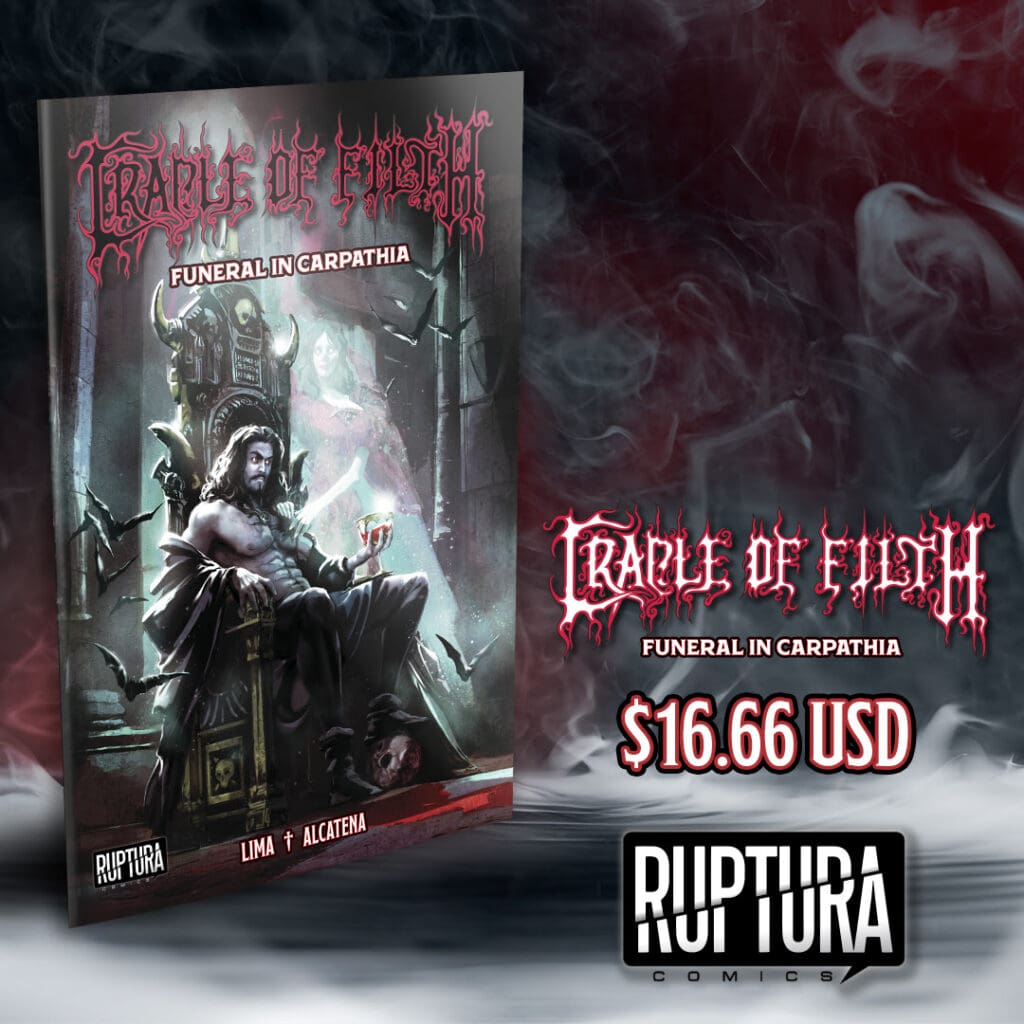 Ruptura Comics is an independent comic book publisher known for delivering bold, immersive narratives across horror, fantasy, and sci-fi. With a commitment to quality and a passion for powerful storytelling, Ruptura has brought unique voices and artistic styles to life, building a reputation as a fresh voice in the comic book industry. Originally based in Mexico, Ruptura Comics is now expanding to the United States and is excited to bring iconic projects, like the Cradle of Filth comic series, to an even broader audience.