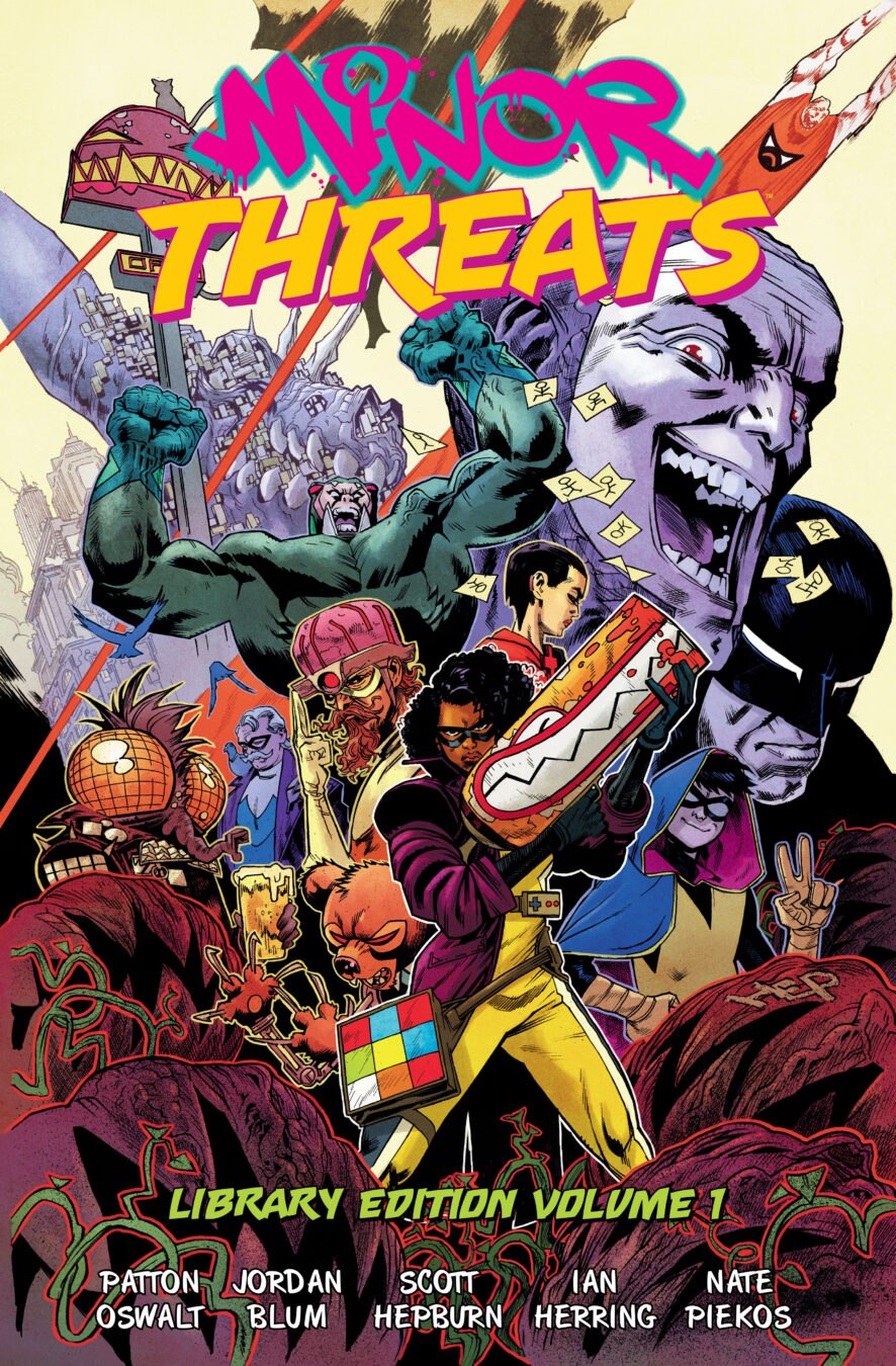 Written by Oswalt (DC Horror Presents, Black Hammer Visions) and Blum (Edge of Spider-Verse , DC Horror Presents), illustrated by Hepburn (M.O.D.O.K.: Head Games), colored by Ian Herring (Welcome to the Maynard, Masterpiece), and lettered by Nate Piekos (Black Hammer: Spiral City, The Umbrella Academy: Hotel Oblivion), the Minor Threats Library Edition collects Volumes 1 and 2 of the superhero and supervillain series together in the signature Dark Horse Library Edition oversized hardcover format with bonus materials featuring a sketchbook section with notes by Scott Hepburn and a cover gallery. The Minor Threats Library Edition Volume 1 also features new cover art by Hepburn.