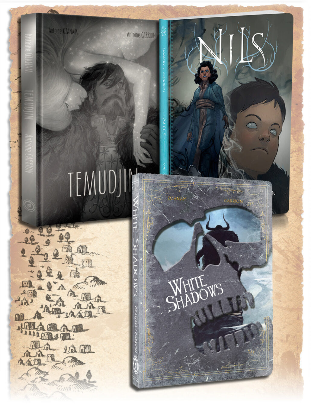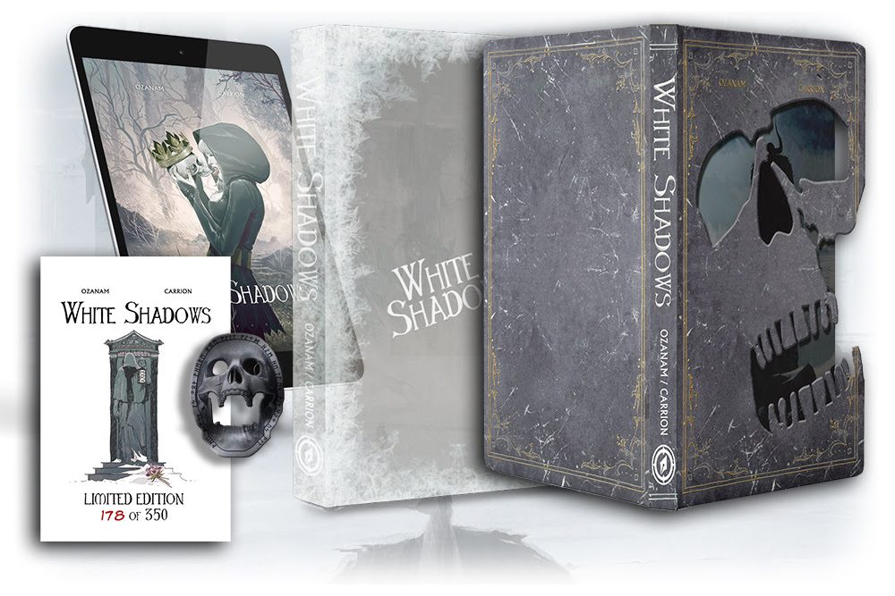 Magnetic Press offers exclusive Kickstarter editions, including a 104-page White Shadows Hardcover Trade Edition with linen texture and spot-UV gloss, plus a Deluxe Die-cut Edition with an acetate sleeve, gatefold map, and collectible key coin. Nils returns in a premium Softcover Edition with updated cover art and a gallery of concept designs, while Temudjin is presented in a stunning 9×12″ gallery-sized hardcover with silver foil and signature curved corners.