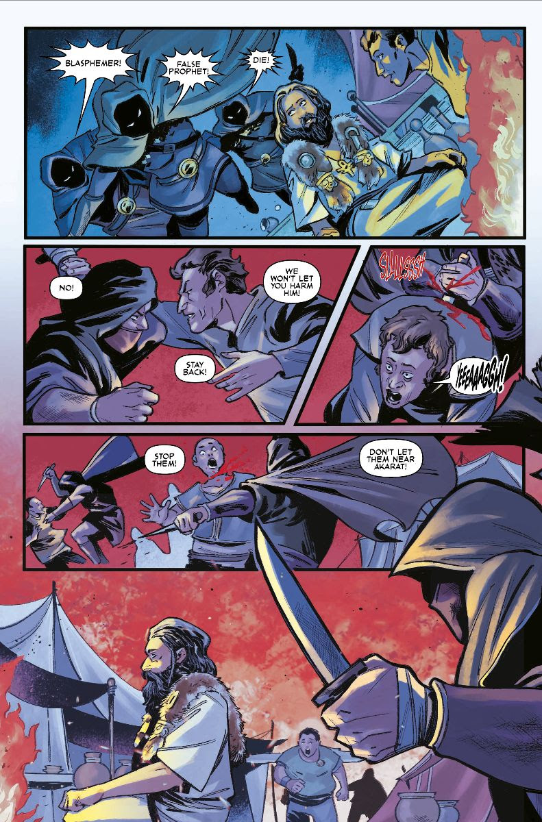 When assassins descend to slaughter Akarat, DIABLO: DAWN OF HATRED #1 (OF 4) forces Derris into a brutal, impossible choice: save the holy man his tribe now worships, or stand aside and watch his people get torn apart in the fallout. That right there is where this story really grabs you by the throat—because this is no simple resurrection tale. It’s a savage collision of faith, loyalty, suspicion, prophecy, and survival.