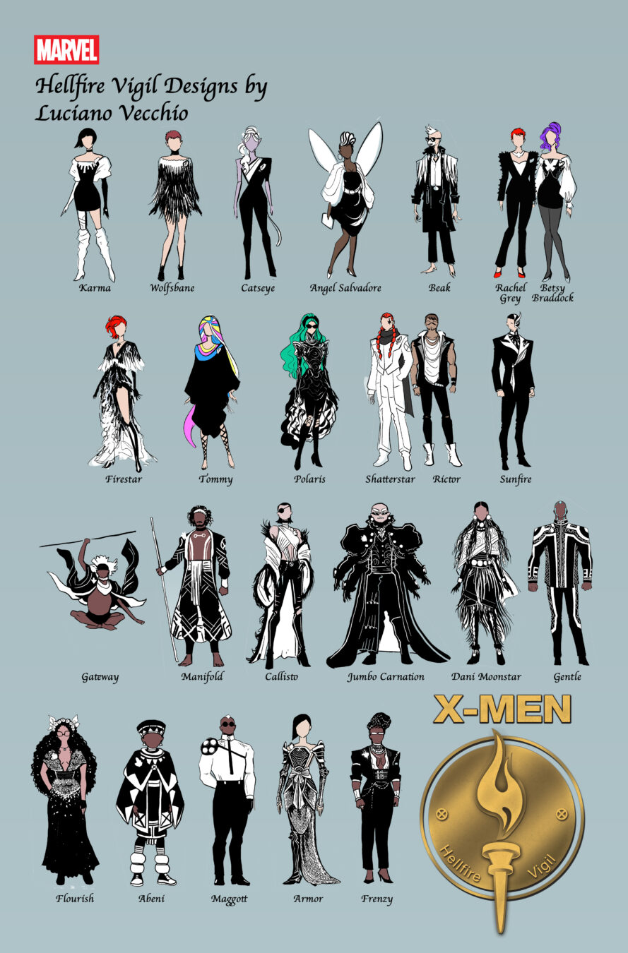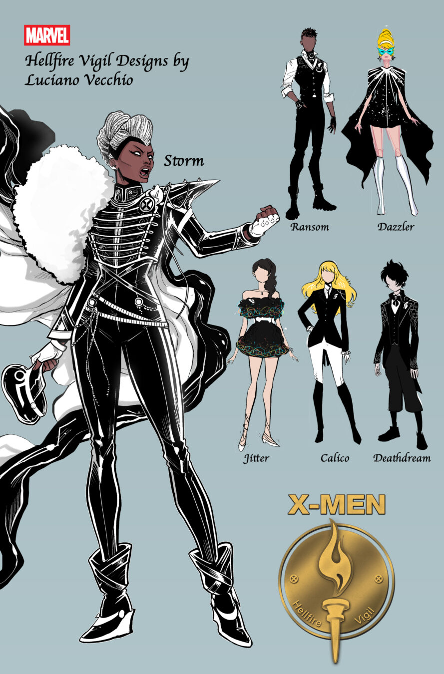 Each year, mutantkind gathers for a night of joyous celebration, mutant pride, and delicious drama at the HELLFIRE GALA! This year’s Hellfire Gala one-shot, X-MEN: HELLFIRE VIGIL #1, strikes a different note as the X-Men reflect on the loss of Krakoa, but it still promises to be mutantkind’s biggest night. And as is tradition, fans can look forward to seeing their favorite characters serve super hero high fashion looks designed by some of the industry’s leading talents! Today, see some of the design work for the giant-sized one-shot from artists Luciano Vecchio, an X-Men superstar known for his current work on Storm and upcoming issues of Uncanny X-Men, and rising star Federica Mancin who makes her exciting X-Men debut next month in Exceptional X-Men #10.