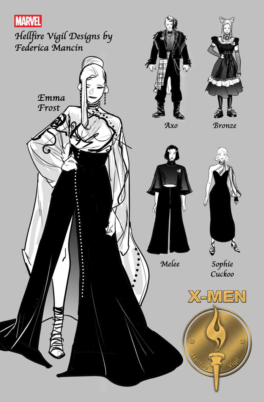 Each year, mutantkind gathers for a night of joyous celebration, mutant pride, and delicious drama at the HELLFIRE GALA! This year’s Hellfire Gala one-shot, X-MEN: HELLFIRE VIGIL #1, strikes a different note as the X-Men reflect on the loss of Krakoa, but it still promises to be mutantkind’s biggest night. And as is tradition, fans can look forward to seeing their favorite characters serve super hero high fashion looks designed by some of the industry’s leading talents! Today, see some of the design work for the giant-sized one-shot from artists Luciano Vecchio, an X-Men superstar known for his current work on Storm and upcoming issues of Uncanny X-Men, and rising star Federica Mancin who makes her exciting X-Men debut next month in Exceptional X-Men #10.