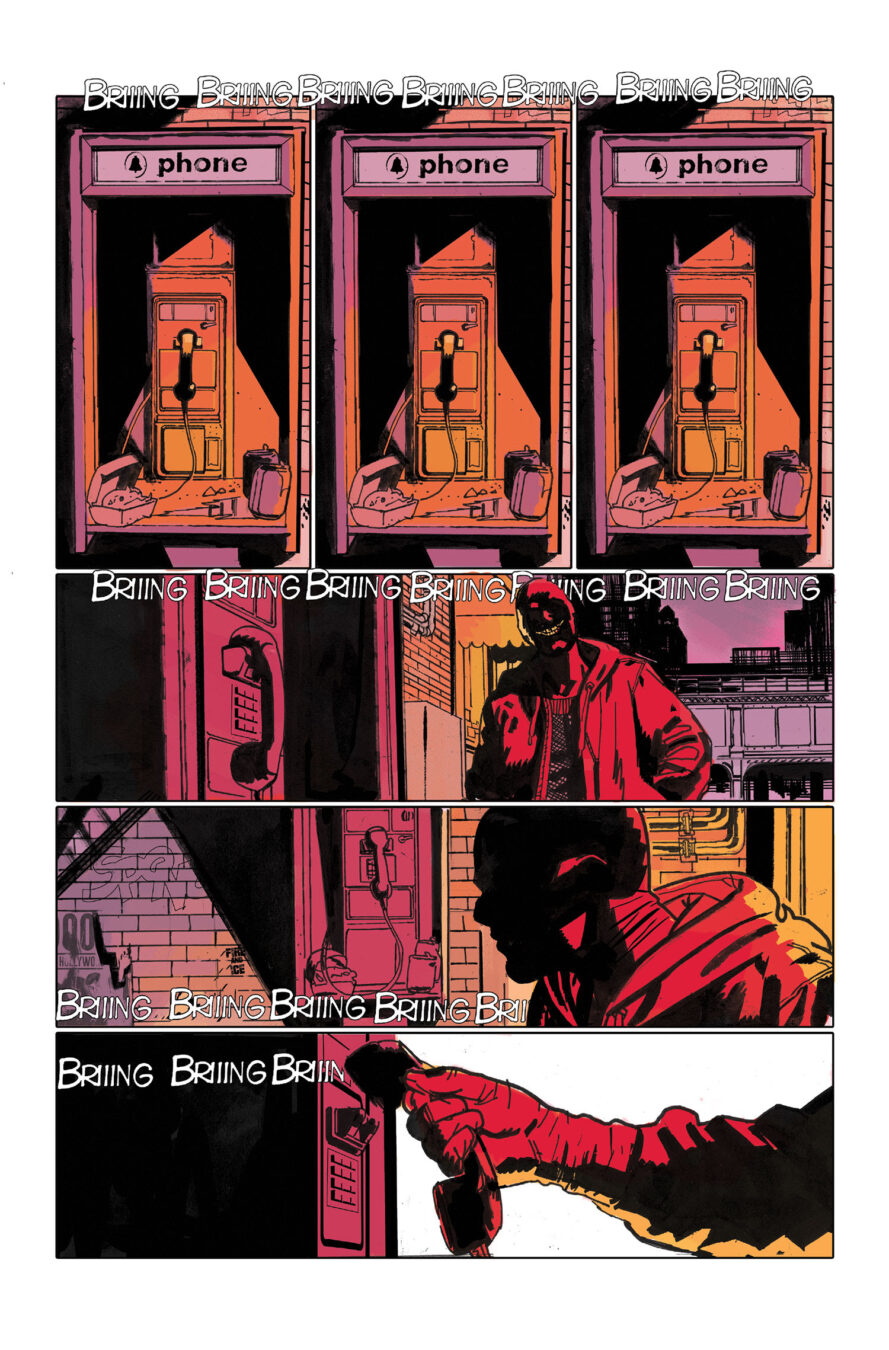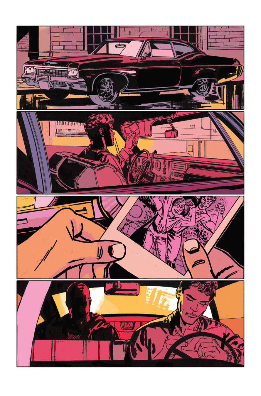Continued Boss: “Trying to get a jumpscare in a comic is hard because most readers tend to scan an entire page briefly as they turn to it. That said, I think Adriano did an incredible job here of selling the terror in this first glimpse of the killer. The reader asks themselves ‘where did that guy come from?’ and as they turn to the next page, realizing he must have been in the car even when Ronny was in there. How long was he back there, waiting?”