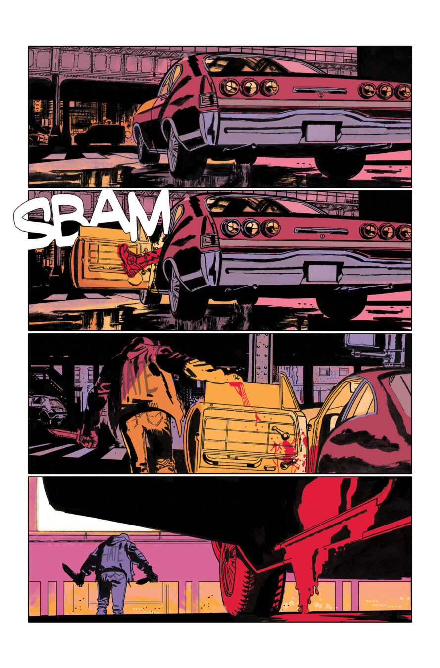 Turtulici added in regards to the layout of page six, where the killer gets out of the car: “I chose this solution for a different perspective of the sequence to keep the tension high. We’ve just witnessed a murder, and I liked the idea of introducing our killer as if he’s still hungry, still craving for more. I hope it creates an unsettling feeling. The story is just beginning and the danger is far from over. Also, this is one of the pages we did for the pitch—I felt it wasn’t the right moment to be too subtle or suggestive. I wanted each page to hit hard, to set the tone of the series.”